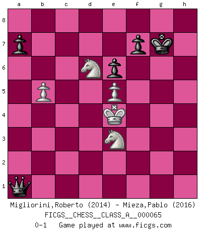 Last move : 0-1 2010 July 12 19:32:55 [Event "FICGS__CHESS__CLASS_A__000065"] [Site "FICGS"] [Date "2010.01.27"] [Round "1"] [White "Migliorini,Roberto"] [Black "Mieza,Pablo"] [Result "0-1"] [WhiteElo "2014"] [BlackElo "2016"] 1.e4 c5 2.c3 Nf6 3.e5 Nd5 4.d4 cxd4 5.Nf3 d6 6.cxd4 e6 7.a3 dxe5 8.dxe5 Be7 9.Bd3 Qc7 10.O-O Nd7 11.Re1 O-O 12.Bg5 Nc5 13.Bc2 Bxg5 14.Nxg5 h6 15.Nf3 Rd8 16.Qd2 Bd7 17.b4 Na4 18.Qd3 g6 19.Bb3 Qb6 20.Qd1 Qb5 21.Qd4 Ne7 22.Qf4 Nf5 23.Nbd2 Nc3 24.Rac1 Rac8 25.Nc4 Nd5 26.Qd2 Be8 27.g4 Nb6 28.Nxb6 Rxd2 29.Nxc8 Nd4 30.Nxd2 Ne2+ 31.Rxe2 Qxe2 32.Nd6 Bc6 33.Rxc6 bxc6 34.N6c4 Qxg4+ 35.Kf1 Qd4 36.Ke2 h5 37.Ba4 Qd5 38.h4 g5 39.hxg5 h4 40.f3 c5 41.Bc2 cxb4 42.axb4 Qd4 43.Be4 h3 44.f4 h2 45.b5 Qg1 46.Ne3 Qg3 47.Bh1 Qxf4 48.Ndc4 Qxg5 49.Bc6 Qh5+ 50.Kd3 h1Q 51.Bxh1 Qxh1 52.Nd6 Qb1+ 53.Kd4 Qa1+ 54.Ke4 Kg7 0-1 Sicilian : Alapin's variation (2.c3) Kingside Castling by player White (move 10) Kingside Castling by player Black (move 11) Promotion Queen by player Black (move 50) 10 pieces endgame at move 51 : White KNNPP , Black KQPPP WHITE : King + 2 Knights 2 Pawns BLACK : King + 1 Queen 3 Pawns Player Black won this chess game. Follow this game move after move (download)Fischer wanted to give the Russians a taste of their own medicine. (Larry Evans) Konzentriere dich auf materielle Gewinne. Nimm, was dir dein Gegner gibt, ausser es gibt einen guten Grund der dagegenspricht. (Robert James Fischer) Mis oponentes también hacen buenas movidas. A veces yo no tomo esas cosas en consideración. (Bobby Fischer) Pour se monter efficace, un Cavalier a besoin d'avant-postes ! Les Cavaliers font les meilleurs bloqueurs de pions passés. Man with more than one clock never knows what time it is. (Chinese thought)