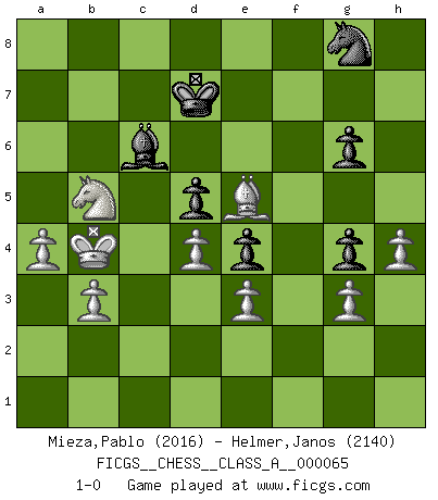Last move : 1-0 2010 September 30 19:54:44 [Event "FICGS__CHESS__CLASS_A__000065"] [Site "FICGS"] [Date "2010.01.27"] [Round "1"] [White "Mieza,Pablo"] [Black "Helmer,Janos"] [Result "1-0"] [WhiteElo "2016"] [BlackElo "2140"] 1.d4 f5 2.g3 Nf6 3.Bg2 e6 4.c4 Bb4+ 5.Bd2 Qe7 6.e3 O-O 7.Ne2 a5 8.Nbc3 d6 9.O-O Nbd7 10.Bc1 Bxc3 11.Nxc3 e5 12.b3 e4 13.f3 b6 14.fxe4 fxe4 15.Rf4 Bb7 16.Bb2 Rf7 17.Qc2 Raf8 18.Qe2 h6 19.Raf1 Kh8 20.h4 Kh7 21.Bh3 g6 22.R1f2 h5 23.Qf1 Kg8 24.Ba3 Ng4 25.Rxf7 Rxf7 26.Rxf7 Qxf7 27.Bxg4 hxg4 28.Qxf7+ Kxf7 29.Nb5 d5 30.Nxc7 Nf6 31.c5 Nd7 32.Nb5 Ke6 33.Kg2 bxc5 34.Bxc5 Nb8 35.a3 Nd7 36.Nc7+ Kf7 37.a4 Kf6 38.Nb5 Ke6 39.Nc7+ Kf7 40.Kf2 Bc6 41.Ke1 Kf6 42.Bd6 Nb6 43.Kd2 Kf7 44.Kc3 Kf6 45.Na6 Bb7 46.Nc5 Bc6 47.Bc7 Nd7 48.Na6 Bb7 49.Bd8+ Ke6 50.Nc7+ Kd6 51.Nb5+ Kc6 52.Na7+ Kd6 53.Bxa5 Nf6 54.Nb5+ Kd7 55.Bc7 Bc6 56.Be5 Ng8 57.Kb4 1-0 Dutch defense Kingside Castling by player Black (move 6) Kingside Castling by player White (move 9) Player White won this chess game. Follow this game move after move (download)Botvinnik tried to take the mystery out of Chess, always relating it to situations in ordinary life. He used to call Chess a typical inexact problem similar to those which people are always having to solve in everyday life. (Garry Kasparov) Du weisst es gibt ein Problem mit Computern und Fernschach, wenn jeder eine Rating von 2450 hat. (John Christen Knudsen) La pasion por jugar al Ajedrez es una de las mas inexplicables en el mundo. (H.G. Wells) Assurément je connaissais par expérience le mystérieux attrait de ce jeu royal, le seul entre tous les jeux inventés par les hommes qui échappe souverainement à la tyrannie du hasard, le seul où l'on ne doive sa victoire qu'à son intelligence ou plutôt à une certaine forme d'intelligence. Mais n'est-ce pas déjà le limiter injurieusement que d'appeler les échecs un jeu ? N'est-ce pas une science, un art ou quelque chose qui, comme le cercueil de Mahomet entre ciel et terre, est suspendu entre l'un et l'autre, et qui réunit un nombre incroyable de contraires ? [...] C'est une pensée qui ne mène à rien, une mathématique qui n'établit rien, un art qui ne laisse pas d'uvre, une architecture sans matière; et il l'a prouvé néanmoins qu'il était plus durable, à sa manière, que les livres ou que tout autre monument, ce jeu unique qui appartient à tous les peuples et à tous les temps, et dont personne ne sait quel dieu en fit don à la terre pour tuer l'ennui, pour aiguiser l'esprit et stimuler l'âme. Où commence-t-il, où finit-il ? (Stefan Zweig) You must do what you feel is right... of course. (Obi-Wan Kenobi in Star Wars ep.4)