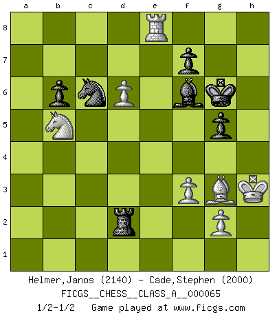 Last move : 1/2-1/2 2010 July 11 16:2:54 [Event "FICGS__CHESS__CLASS_A__000065"] [Site "FICGS"] [Date "2010.01.27"] [Round "1"] [White "Helmer,Janos"] [Black "Cade,Stephen"] [Result "1/2-1/2"] [WhiteElo "2140"] [BlackElo "2000"] 1.d4 Nf6 2.c4 g6 3.Nc3 d5 4.cxd5 Nxd5 5.e4 Nxc3 6.bxc3 Bg7 7.Nf3 c5 8.Rb1 O-O 9.Be2 b6 10.O-O Bb7 11.Qd3 Qc7 12.Bg5 h6 13.Bh4 cxd4 14.cxd4 Qf4 15.d5 Ba6 16.Qd1 Qxe4 17.Bxa6 Nxa6 18.Re1 Qf5 19.Bxe7 Rfe8 20.d6 Nc5 21.Nd4 Qd7 22.Qd2 Rac8 23.Rbc1 Qb7 24.Nb5 Qd7 25.Nc3 Qf5 26.Nd5 Ne4 27.Rxc8 Rxc8 28.Bh4 Nxd2 29.Ne7+ Kh7 30.Nxf5 g5 31.Bg3 Bf6 32.f3 Nc4 33.Ne7 Rd8 34.Nc6 Rc8 35.Nxa7 Ra8 36.Nb5 Rxa2 37.Re4 Na5 38.h4 Kg6 39.hxg5 hxg5 40.Kh2 Nc6 41.Kh3 Rd2 42.Re8 1/2-1/2 King's Indian defense, 3.Nc3 Kingside Castling by player Black (move 8) Kingside Castling by player White (move 10) This chess game ended in a draw. Follow this game move after move (download)Chess problems demand from the composer the same virtues that characterize all worthwhile art: originality, invention, conciseness, harmony, complexity, and splendid insincerity. (Vladimir Nabokov) Ich habe Putins Aufstieg an die Macht beobachtet und seine Politik, die demokratischen Institutionen meines Landes zu zerstören. (Garry Kasparov) El Ajedrez expande y enriquece tu mente. (Saudin Robovic) Ne tendez aucun piège pour le plaisir ! Ne jouez rien dans l'espoir que l'adversaire réagisse de façon stupide ! Prenez toujours pour acquis que l'adversaire va trouver le meilleur coup ! Ne jouez jamais de coup dans l'espoir que l'adversaire ne voie pas la menace ! Chacun de vos coups doit améliorer la position d'une façon ou d'une autre. Convictions are more dangerous enemies of truth than lies. (Friedrich Nietzsche)
