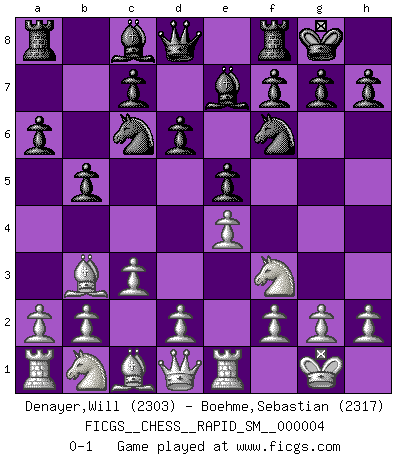 Last move : 0-1 2010 April 7 8:45:56 [Event "FICGS__CHESS__RAPID_SM__000004"] [Site "FICGS"] [Date "2010.01.27"] [Round "1"] [White "Denayer,Will"] [Black "Boehme,Sebastian"] [Result "0-1"] [WhiteElo "2303"] [BlackElo "2317"] 1.e4 e5 2.Nf3 Nc6 3.Bb5 a6 4.Ba4 Nf6 5.O-O Be7 6.Re1 b5 7.Bb3 d6 8.c3 O-O 0-1 This chess game has been lost on time (started : 2010.01.27 15:15:48) Ruy Lopez : Closed Kingside Castling by player White (move 5) Kingside Castling by player Black (move 8) Player Black won this chess game. Follow this game move after move (download)By the beauty of his games, the clarity of his play, and the brilliance of his ideas, Fischer made himself an artist of the same stature as Brahms, Rembrandt, and Shakespeare. (David Levy) Mein Name ist Rustam Kamsky. Sie haben meinen Sohn belästigt. Bereiten Sie sich aufs Sterben vor. (Rustam Kamsky) A la fecha, Fischer esta simplemente un nivel arriba de todos los mejores jugadores de Ajedrez del mundo. (John Jacobs) En blitz, le Cavalier l'emporte sur le Fou. (Vlastimil Hort) Inventor: A person who makes an ingenious arrangement of wheels, levers and springs, and believes it civilization. (Ambrose Bierce, The Devil's Dictionary)