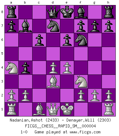 Last move : 1-0 2010 April 4 20:32:27 [Event "FICGS__CHESS__RAPID_SM__000004"] [Site "FICGS"] [Date "2010.01.27"] [Round "1"] [White "Nadanian,Ashot"] [Black "Denayer,Will"] [Result "1-0"] [WhiteElo "2433"] [BlackElo "2303"] 1.d4 Nf6 2.c4 e6 3.Nf3 d5 4.Nc3 c6 5.e3 Nbd7 6.Bd3 dxc4 7.Bxc4 b5 8.Bd3 Bb7 9.e4 b4 10.Na4 1-0 This chess game has been lost on time (started : 2010.01.27 15:15:48) Queen's pawn game Player White won this chess game. Follow this game move after move (download)Only sissies Castle. (Rob Sillars) Du weisst es gibt ein Problem mit Computern und Fernschach, wenn jeder eine Rating von 2450 hat. (John Christen Knudsen) Debemos de asegurarnos de que el Ajedrez no se convierta en un lenguaje muerto, muy interesante, pero tan solo para un grupo muy pequeño. (Sytze Faber) Des combinaisons [dans le jeu d'échecs] pareilles à des mélodies. Je crois entendre pour ainsi dire la musique des coups... (Vladimir Nabokov) The project of the man are lower than those of the sky. (Chinese proverb)
