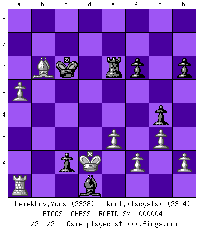 Last move : 1/2-1/2 2010 May 2 8:25:26 [Event "FICGS__CHESS__RAPID_SM__000004"] [Site "FICGS"] [Date "2010.01.27"] [Round "1"] [White "Lemekhov,Yura"] [Black "Krol,Wladyslaw"] [Result "1/2-1/2"] [WhiteElo "2328"] [BlackElo "2314"] 1.d4 Nf6 2.c4 e6 3.Nf3 d5 4.Nc3 h6 5.g3 Bb4 6.Bg2 c5 7.O-O Nc6 8.Be3 cxd4 9.Nxd4 Bxc3 10.bxc3 O-O 11.cxd5 exd5 12.c4 dxc4 13.Nxc6 bxc6 14.Bxc6 Bh3 15.Qxd8 Rfxd8 16.Rfc1 Rac8 17.Bb5 c3 18.Bxa7 Nd5 19.e3 c2 20.Bd4 Be6 21.Ba4 Bf5 22.Kf1 Rd6 23.a3 Nb6 24.Bb3 Nc4 25.Bxc4 Rxc4 26.a4 Ra6 27.a5 Bg4 28.Ra2 Bd1 29.Bb6 f6 30.Ke1 Kf7 31.Rb2 g5 32.Kd2 Ra4 33.Rb5 Ra8 34.Kc3 g4 35.Rc5 Re8 36.Rc4 Rxc4+ 37.Kxc4 Re6 38.Kc3 Ke7 39.Kd2 Kd7 40.Ra1 Kc6 1/2-1/2 Queen's pawn game Kingside Castling by player White (move 7) Kingside Castling by player Black (move 10) This chess game ended in a draw. Follow this game move after move (download)I'm not a materialistic person, in that, I don't suffer the lack or loss of money. The absence of worldly goods I don't look back on. For Chess is a way I can be as materialistic as I want without having to sell my soul. (Jamie Walter Adams) Ein guter Spieler hat immer Glück. (José Raúl Capablanca) El juego de Damas es para vagabundos. (Paul Morphy) Aux échecs, les retours au sommet sont rares : les dommages psychologiques consécutifs à une défaite sont trop sévères. (Daily Telegraph) Work expands to fill the time available. (C. Northcote Parkinson, in Parkinson's Laws)