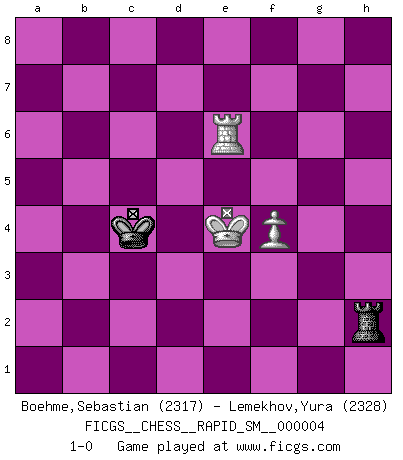 Last move : 1-0 2010 July 27 6:18:32 [Event "FICGS__CHESS__RAPID_SM__000004"] [Site "FICGS"] [Date "2010.01.27"] [Round "1"] [White "Boehme,Sebastian"] [Black "Lemekhov,Yura"] [Result "1-0"] [WhiteElo "2317"] [BlackElo "2328"] 1.d4 d5 2.c4 e6 3.Nc3 Nf6 4.Nf3 c6 5.Bg5 h6 6.Bh4 dxc4 7.e4 g5 8.Bg3 b5 9.Be2 Bb7 10.Ne5 Nbd7 11.O-O h5 12.Nxd7 Qxd7 13.Qc1 Be7 14.Rd1 Ng4 15.f3 h4 16.Be1 Nh6 17.b3 cxb3 18.axb3 a5 19.d5 Kf8 20.dxc6 Qxc6 21.Nxb5 g4 22.Qb2 e5 23.Rac1 Bc5+ 24.Kh1 gxf3 25.Bxf3 Qxb5 26.Be2 Qb6 27.Qxe5 Rg8 28.Rxc5 Re8 29.Rb5 Rxe5 30.Rxb6 Bxe4 31.Bf3 Bxf3 32.gxf3 Rg6 33.Rb8+ Re8 34.Rxe8+ Kxe8 35.Bxh4 Kf8 36.Bd8 Nf5 37.Bxa5 Nh4 38.Rd3 Rc6 39.Kg1 f6 40.b4 Kf7 41.Rb3 Rc1+ 42.Kf2 Rc2+ 43.Kf1 Rc1+ 44.Ke2 Nf5 45.Kd3 Nd6 46.Bb6 Ke6 47.Bc5 Nb5 48.h4 Kd5 49.Rb2 Rc3+ 50.Ke2 Rc4 51.Bf2 Rc8 52.h5 Kc4 53.Rc2+ Nc3+ 54.Kf1 Kd3 55.Rb2 Nd1 56.Rb3+ Kc2 57.Ra3 Rh8 58.Ra5 Nxf2 59.Kxf2 Kc3 60.Rf5 Kxb4 61.Rxf6 Rxh5 62.Ke3 Kc4 63.Ke4 Rh8 64.Re6 Rh2 65.f4 1-0 QGD Semi-Slav Kingside Castling by player White (move 11) 10 pieces endgame at move 37 : White KRBPPP , Black KRNP WHITE : King + 1 Rook 1 Bishop 3 Pawns BLACK : King + 1 Rook 1 Knight 1 Pawn 9 pieces endgame at move 58 : White KRPPP , Black KRNP WHITE : King + 1 Rook 3 Pawns BLACK : King + 1 Rook 1 Knight 1 Pawn 8 pieces endgame at move 59 : White KRPPP , Black KRP WHITE : King + 1 Rook 3 Pawns BLACK : King + 1 Rook 1 Pawn 7 pieces endgame at move 60 : White KRPP , Black KRP WHITE : King + 1 Rook 2 Pawns BLACK : King + 1 Rook 1 Pawn 6 pieces endgame at move 61 : White KRPP , Black KR WHITE : King + 1 Rook 2 Pawns BLACK : King + 1 Rook 5 pieces endgame at move 61 : White KRP , Black KR WHITE : King + 1 Rook 1 Pawn BLACK : King + 1 Rook Player White won this chess game. Follow this game move after move (download)Chess is a foolish expedient for making idle people believe they are doing something very clever when they are only wasting their time. (George Bernard Shaw) Wer wird heute Abend ihr Gegner sein? -- Heute Abend spiele ich gegen die schwarzen Steine. (Akiba Rubinstein) El Ajedrez es tortura mental. (Garry Kasparov) La vie et les Echecs sont tous les deux une lutte constante. (Lasker) When I took office, only high energy physicists had ever heard of what is called the World Wide Web... Now even my cat has its own page. (Bill Clinton, 1996)