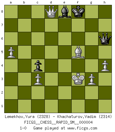 Last move : 1-0 2010 May 28 15:33:47 [Event "FICGS__CHESS__RAPID_SM__000004"] [Site "FICGS"] [Date "2010.01.27"] [Round "1"] [White "Lemekhov,Yura"] [Black "Khachaturov,Vadim"] [Result "1-0"] [WhiteElo "2328"] [BlackElo "2314"] 1.d4 d5 2.c4 c6 3.Nf3 Nf6 4.Nc3 e6 5.Bg5 h6 6.Bh4 dxc4 7.e4 g5 8.Bg3 b5 9.Be2 Bb7 10.h4 g4 11.Ne5 h5 12.O-O Nbd7 13.Qc2 Nxe5 14.Bxe5 Bg7 15.Rad1 O-O 16.Bg3 Nd7 17.f3 Qb6 18.Kh1 c5 19.d5 Bxc3 20.bxc3 exd5 21.exd5 Qg6 22.Qb2 Nb6 23.fxg4 Rae8 24.Rf5 f6 25.Qb1 Kg7 26.Bf3 hxg4 27.Be4 Na4 28.Rf4 Qh5 29.Qc2 Nb6 30.Qf2 f5 31.Rxf5 Rxf5 32.Bxf5 Nxd5 33.Bd7 Re7 34.Bxb5 Ne3 35.Re1 Qd5 36.Bf4 Rf7 37.Rxe3 Rxf4 38.Qg3 a6 39.Ba4 Qd6 40.Kh2 Qf6 41.Bd7 Re4 42.Rxe4 Bxe4 43.Bxg4 Kh7 44.Be2 Bd5 45.Kg1 Qe7 46.Bg4 Kh8 47.Bc8 a5 48.Qf4 Kg7 49.Kf2 Bf7 50.Bf5 Qb7 51.Qg5+ Kf8 52.Qh6+ Ke7 53.Qe3+ Kd8 54.Qxc5 Qb2+ 55.Kg1 Qc1+ 56.Kh2 Qf4+ 57.g3 Qd2+ 58.Kh3 Ke8 59.Qxa5 Kf8 60.a4 Qe1 61.Qd8+ Kg7 62.Qd4+ Kf8 63.a5 Qf1+ 64.Kg4 Qe2+ 65.Kf4 Qf1+ 66.Kg5 Qc1+ 67.Kg4 Qh6 68.Qd8+ Be8 69.Kf3 1-0 QGD Slav : 4.Nc3 Kingside Castling by player White (move 12) Kingside Castling by player Black (move 15) Player White won this chess game. Follow this game move after move (download)It is the aim of the modern school, not to treat every position according to one general law, but according to the principle inherent in the position. (Richard Reti) Sicherlich können nur Meister einen Stil haben. Daß ein nicht-Meister auch nur ein einziges Mal in seinem Leben eine Partie folgerecht durchführte, habe ich niemals bemerkt. (Emanuel Lasker) Repentinamente, me resultaba obvio en mi analisis que yo había pasado por alto lo que Fischer había visto en el tablero con la mas grande facilidad. (Mikhail Botvinnik) Le système Elo représente seulement une moyenne. Il est simplement un indicateur de votre stabilité. (Anatoli Karpov) Perhaps the current trend of many chess professionals taking up the more lucrative pastime of poker is not a wholly negative one. It may not be too late for humans to relearn how to take risks in order to innovate and thereby maintain the advanced lifestyles we enjoy. And if it takes a poker-playing supercomputer to remind us that we can't enjoy the rewards without taking the risks, so be it. (The Chess Master and the Computer, by Garry Kasparov - 2010)