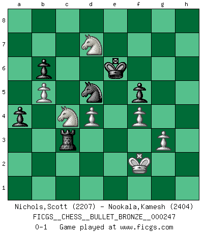 Last move : 0-1 2010 April 24 19:0:27 [Event "FICGS__CHESS__BULLET_BRONZE__000247"] [Site "FICGS"] [Date "2010.04.24"] [Round "1"] [White "Nichols,Scott"] [Black "Nookala,Kamesh"] [Result "0-1"] [WhiteElo "2207"] [BlackElo "2404"] 1.e4 c5 2.b3 Nc6 3.Bb2 e5 4.Bb5 Nd4 5.Bxd4 cxd4 6.Nf3 g6 7.O-O Bg7 8.a4 Ne7 9.Re1 O-O 10.c3 a6 11.Bc4 b6 12.Qc2 Bb7 13.cxd4 exd4 14.Na3 d5 15.exd5 d3 16.Qxd3 Bxa1 17.Rxa1 Nxd5 18.Qd4 Qf6 19.Nc2 Kg7 20.Qxf6+ Kxf6 21.Nfd4 Rfd8 22.f3 Nc7 23.d3 Rac8 24.Ra2 Rd7 25.Kf2 h6 26.b4 Rcd8 27.Nb3 Nd5 28.b5 a5 29.Ra1 Nf4 30.d4 Rc7 31.Ne3 Bd5 32.Rc1 Bxc4 33.Rxc4 Rxc4 34.Nxc4 Nd5 35.Nbd2 Ke6 36.Ke1 Rc8 37.g3 f6 38.h4 g5 39.hxg5 hxg5 40.Kf2 Rh8 41.Kg2 Rb8 42.Ne4 f5 43.Nxg5+ Kf6 44.f4 Rc8 45.Ne5 Rc2+ 46.Kf3 Ra2 47.Ngf7 Rxa4 48.Nd6 Ra3+ 49.Kf2 a4 50.Ndc4 Rc3 51.Nd7+ Ke6 0-1 Sicilian defense Kingside Castling by player White (move 7) Kingside Castling by player Black (move 9) Player Black won this chess game. Follow this game move after move (download)Place the contents of the Chess box in a hat, shake them up vigorously, pour them on the board from a height of two feet, and you get the style of Steinitz. (H. E. Bird) Kann Schach nicht schließlich das Nationalspiel der Deutschen werden? Und welche weiteren Ausblicke bieten sich dann dar! Welche Hebung des allgemeinen Kultur-Niveaus, ja der Moral, wenn das Schachbrett den Kartentisch verdrängen würde! Wahrlich, ein Ziel, des Schweißes der Edlen wert! (Siegbert Tarrasch) El Ajedrez era la lengua materna de Capablanca. (Reti) Nous sommes les pions de la mystérieuse partie d'Echecs jouée par Dieu. Il nous déplace, nous arrête, nous pousse encore, puis nous lance un à un dans la boîte du Néant. Epitaphe sur la tombe de David Janowsky (1868-1927). Computers are like Old Testament gods; lots of rules and no mercy. (Joseph Campbell)
