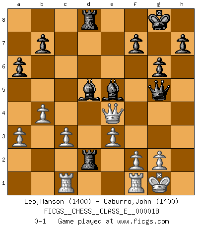 Last move : 0-1 2006 November 18 5:28:28 [Event "FICGS__CHESS__CLASS_E__000018"] [Site "FICGS"] [Date "2006.10.17"] [Round "1"] [White "Leo,Hanson"] [Black "Caburro,John"] [Result "0-1"] [WhiteElo "1400"] [BlackElo "1400"] 1.d4 Nf6 2.h3 g6 3.Nc3 c5 4.Qd3 cxd4 5.Qxd4 Nc6 6.Qd1 Bg7 7.e3 O-O 8.Be2 d5 9.a3 e5 10.Nf3 a6 11.Na4 Qa5+ 12.Nc3 Rd8 13.Bd2 Qc7 14.Bd3 e4 15.Nxd5 Nxd5 16.Bxe4 Nb6 17.c3 Nc4 18.Qc2 Be6 19.Bxc6 Qxc6 20.O-O Bf5 21.Qb3 Nxd2 22.Nxd2 Rxd2 23.Qb4 Rad8 24.Rac1 Be5 25.Qh4 Qf6 26.Qc4 Qg5 27.Qb4 Bxh3 28.Qe4 Be6 29.b4 Bd5 0-1 Queen's pawn game Kingside Castling by player Black (move 7) Kingside Castling by player White (move 20) Player Black won this chess game. Follow this game move after move (download)Chess is a terrific way for kids to build self image and self esteem. (Saudin Robovic) Ohne Leiden bildet sich kein Charakter. (Ernst Freiherr von Feuchtersleben) Aquel que toma al Peón de Caballo de la Reina, se pasará la noche a dormir en la calle. (Anónimo) Des points faibles ou des trous dans la position de l'adversaire doivent être occupés par des pièces et non pas par des pions. (Siegbert Tarrasch) Vladimir Ras-Putin is still alive... He is also a good actor, I saw him in the Lord of the Rings. (Rodolfo d'Ettorre)