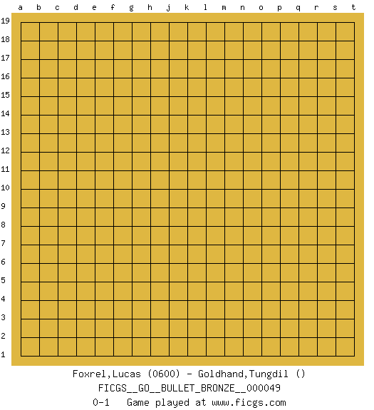 Last move : 0-1 2010 January 28 20:36:45 [Event "FICGS__GO__BULLET_BRONZE__000049"] [Site "FICGS"] [Date "2010.01.28"] [Round "1"] [Black "Foxrel,Lucas"] [White "Goldhand,Tungdil"] [Result "0-1"] [Rating 1 "0600"] 0-1 This go game has been lost on time (started : 2010.01.28 12:14:1) Here are the names of the openings (joseki) played in the four corners : Player White won this Go (weiqi, baduk) game. Follow this game move after move (download)Extend one hand from the cutting points. (Anonymous) Don't be discouraged. It's often the last key in the bunch that opens the lock. (Author unknown)
