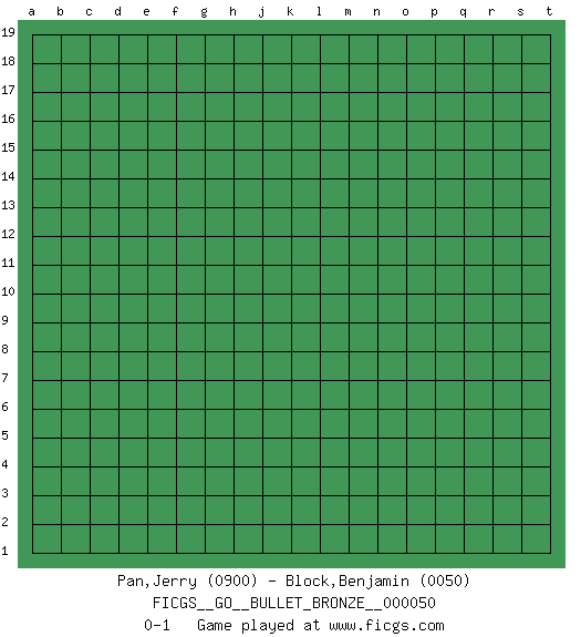 Last move : 0-1 2010 January 28 22:51:23 [Event "FICGS__GO__BULLET_BRONZE__000050"] [Site "FICGS"] [Date "2010.01.28"] [Round "1"] [Black "Pan,Jerry"] [White "Block,Benjamin"] [Result "0-1"] [Rating 1 "0900"] [Rating 2 "0050"] 0-1 This go game has been lost on time (started : 2010.01.28 21:43:10) Here are the names of the openings (joseki) played in the four corners : Player White won this Go (weiqi, baduk) game. Follow this game move after move (download)For rectangular six in the corner, dame is necessary. (Anonymous) Knowledge rests not upon truth alone, but upon error also. (Carl G. Jung)