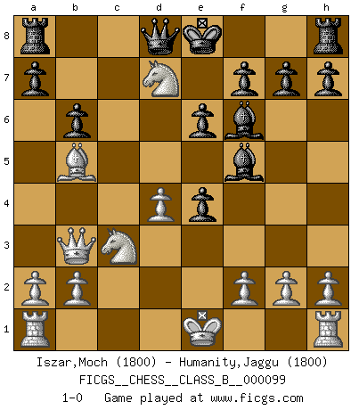 Last move : 1-0 2010 April 25 9:30:22 [Event "FICGS__CHESS__CLASS_B__000099"] [Site "FICGS"] [Date "2010.01.29"] [Round "1"] [White "Iszar,Moch"] [Black "Humanity,Jaggu"] [Result "1-0"] [WhiteElo "1800"] [BlackElo "1800"] 1.d4 d5 2.c4 c6 3.Nf3 Bf5 4.cxd5 cxd5 5.Qb3 b6 6.Nc3 Nf6 7.Bg5 e6 8.e4 dxe4 9.Bb5+ Nbd7 10.Ne5 Be7 11.Bxf6 Bxf6 12.Nxd7 1-0 This chess game has been lost on time (started : 2010.01.29 4:43:12) QGD Slav : 3.Nf3 Player White won this chess game. Follow this game move after move (download)Those who say they understand Chess, understand nothing. (Robert Hubner) Ich bin stolz ein Bulgare zu sein. (Veselin Topalov) Entre mas años cumplo, mas valoro los Peones. (Keres) Roi des jeux et jeu des rois, les échecs portent en eux un sentiment d'infini. Ils donnent à celui qui s'est efforcé d'en approfondir les arcanes l'impression de n'être pas à la mesure de l'homme; en fait, ils constituent un résumé de l'univers, un microcosme, et figurent cette grande échelle qui, dans les plans de la lumière descend jusqu'à la matière, qui des abîmes insondables remonte jusqu'en l'infini de Dieu. (Pyrame) It's not a bug - it's an undocumented feature. (Anonymous)