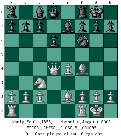 Last move : 1-0 2010 March 27 9:33:44 [Event "FICGS__CHESS__CLASS_B__000099"] [Site "FICGS"] [Date "2010.01.29"] [Round "1"] [White "Konig,Paul"] [Black "Humanity,Jaggu"] [Result "1-0"] [WhiteElo "1893"] [BlackElo "1800"] 1.e4 e5 2.Nf3 Nc6 3.d4 exd4 4.Nxd4 Nxd4 5.Qxd4 d6 6.Nc3 Nf6 7.Be2 Be7 8.O-O O-O 9.Bf4 1-0 This chess game has been lost on time (started : 2010.01.29 4:43:12) Scotch game Kingside Castling by player White (move 8) Kingside Castling by player Black (move 8) Player White won this chess game. Follow this game move after move (download)If a ruler does not understand Chess, how can he rule over a kingdom ? (King Khusros II) Ein Remis kann durch Wiederholung von drei Zügen oder durch einen schlechte Zug erreicht werden. (Savielly Grigorievitsch Tartakower) El Ajedrez hace al hombre ser mas sabio y ver mas claro. (Vladimir Putin) Des points faibles ou des trous dans la position de l'adversaire doivent être occupés par des pièces et non pas par des pions. (Siegbert Tarrasch) See no evil, hear no evil, speak no evil. (The 3 monkeys)