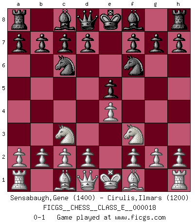 Last move : 0-1 2006 December 11 5:53:5 [Event "FICGS__CHESS__CLASS_E__000018"] [Site "FICGS"] [Date "2006.10.17"] [Round "1"] [White "Sensabaugh,Gene"] [Black "Cirulis,Ilmars"] [Result "0-1"] [WhiteElo "1400"] [BlackElo "1200"] 1.e4 Nc6 2.Nf3 Nf6 3.Nc3 e5 0-1 This chess game has been lost on time (started : 2006.10.17 5:26:11) KP : Nimzovich defense Player Black won this chess game. Follow this game move after move (download)Castle early and often. (Rob Sillars) Ich bewundere Kasparows phantasievolle Angriffssiege aus den Achtzigern und Neunzigern, aber wenn man sie mit dem Computer überprüft, nimmt der Computer in jeder zweiten Partie die Opfer an, verteidigt sich und gewinnt. (Vladimir Kramnik) El Rey es una pieza de pelea. ¡Usenlo!. (Wilhelm Steinitz) Un journaliste : 'Vous préférez avoir une dame de plus sur l'échiquier ou au lit ?' Boris Spassky : 'Ca dépend de la position.' . 'gn is not allowed in chess unless n is an integer between 1 and 8 inclusive, where 1 and 8 are to interpreted as the standard numerals standing for integers in the ordered real-closed field R, with the *canonical* ordering. (As opposed to, say, an integer in the domain Z[2+i*sqrt(5)] or an integer in some exotic Grothendieck topos). (Normajean Yates)