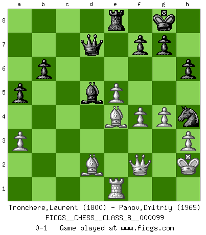 Last move : 0-1 2010 July 31 9:52:54 [Event "FICGS__CHESS__CLASS_B__000099"] [Site "FICGS"] [Date "2010.01.29"] [Round "1"] [White "Tronchere,Laurent"] [Black "Panov,Dmitriy"] [Result "0-1"] [WhiteElo "1800"] [BlackElo "1965"] 1.e4 e5 2.Nf3 Nf6 3.Nxe5 d6 4.Nf3 Nxe4 5.d4 d5 6.Bd3 Bd6 7.O-O O-O 8.c4 c6 9.Re1 Re8 10.cxd5 cxd5 11.Nc3 Nxc3 12.bxc3 Rxe1+ 13.Qxe1 h6 14.Rb1 b6 15.Qe2 Nc6 16.h3 Qe7 17.Be3 Qc7 18.Re1 Bd7 19.Bc2 Ne7 20.Bd2 Ng6 21.Ne5 Bxe5 22.dxe5 Re8 23.f4 Ne7 24.g4 d4 25.Qd3 dxc3 26.Bxc3 Ng6 27.Bb4 Be6 28.Bb1 Qc6 29.Kh2 Qa4 30.a3 a5 31.Bc2 Qc6 32.Bd2 Bc8 33.Qe4 Qd7 34.Qe2 Ba6 35.Qf2 Bd3 36.Bd1 Bc4 37.Bf3 Nh4 38.Be4 Bd5 0-1 This chess game has been lost on time (started : 2010.01.29 4:43:12) Petrov : Classical attack, Marshall variation Kingside Castling by player White (move 7) Kingside Castling by player Black (move 7) Player Black won this chess game. Follow this game move after move (download)Half the variations which are calculated in a tournament game turn out to be completely superfluous. Unfortunately, no one knows in advance which half. (Jan Tinman) Deine Wertungszahl - vorausgesetzt einige Jahre schachliche Anstrengung - entspricht etwa dem zehnfachen Deines IQ plus 1000. (Jonathan Levitt) La enorme capacidad mental, en la que sin ella no puede un jugador de Ajedrez existir, es demasiado requerida por el Ajedrez al grado de que nunca podrá liberar su mente de este juego. (Albert Einstein) Assurément je connaissais par expérience le mystérieux attrait de ce jeu royal, le seul entre tous les jeux inventés par les hommes qui échappe souverainement à la tyrannie du hasard, le seul où l'on ne doive sa victoire qu'à son intelligence ou plutôt à une certaine forme d'intelligence. Mais n'est-ce pas déjà le limiter injurieusement que d'appeler les échecs un jeu ? N'est-ce pas une science, un art ou quelque chose qui, comme le cercueil de Mahomet entre ciel et terre, est suspendu entre l'un et l'autre, et qui réunit un nombre incroyable de contraires ? [...] C'est une pensée qui ne mène à rien, une mathématique qui n'établit rien, un art qui ne laisse pas d'uvre, une architecture sans matière; et il l'a prouvé néanmoins qu'il était plus durable, à sa manière, que les livres ou que tout autre monument, ce jeu unique qui appartient à tous les peuples et à tous les temps, et dont personne ne sait quel dieu en fit don à la terre pour tuer l'ennui, pour aiguiser l'esprit et stimuler l'âme. Où commence-t-il, où finit-il ? (Stefan Zweig) God, you are such an idiot. - Actually, I thought I was more of a jerk. (Gregory House to Stacy Warner, House M.D.)