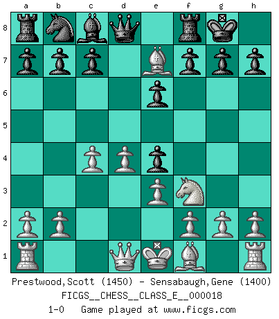 Last move : 1-0 2006 December 5 5:6:14 [Event "FICGS__CHESS__CLASS_E__000018"] [Site "FICGS"] [Date "2006.10.17"] [Round "1"] [White "Prestwood,Scott"] [Black "Sensabaugh,Gene"] [Result "1-0"] [WhiteElo "1450"] [BlackElo "1400"] 1.d4 d5 2.c4 e6 3.Nc3 Nf6 4.Bg5 Be7 5.e3 O-O 6.Nf3 Ne4 7.Nxe4 dxe4 8.Bxe7 1-0 This chess game has been lost on time (started : 2006.10.17 5:26:11) QGD : 6.Nf3 Kingside Castling by player Black (move 5) Player White won this chess game. Follow this game move after move (download)Chess demands total concentration. (Bobby Fischer) Als ich elf wurde, wurde ich einfach gut. (Robert James Fischer) El Ajedrez demanda una total concentración. (Bobby Fischer) La tactique, c'est ce que vous faites quand il y a quelque chose à faire; la stratégie, c'est ce que vous faites quand il n'y a rien à faire. (Savielli Tartacower) You cannot beat a roulette table unless you steal money from it. (Albert Einstein)