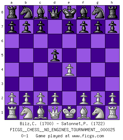 Last move : 0-1 2010 March 13 9:52:29 [Event "FICGS__CHESS__NO_ENGINES_TOURNAMENT__000025"] [Site "FICGS"] [Date "2010.01.30"] [Round "1"] [White "Bilz,Constantin"] [Black "Satonnet,Patrick"] [Result "0-1"] [WhiteElo "1700"] [BlackElo "1722"] 1.e4 d5 0-1 This chess game has been lost on time (started : 2010.01.30 2:54:43) Scandinavian (centre counter) defense Player Black won this chess game. Follow this game move after move (download)Everything is in a state of flux, and this includes the world of Chess. (Mikhail Botvinnik) Ich spiele 70 Eröffnungssysteme. (Viktor Kortschnoi) El Ajedrez demanda una total concentración. (Bobby Fischer) Les pièces de l'échiquier étaient impitoyables. Elles le retenaient, elles l'absorbaient. Il y avait de l'horreur en cela, mais aussi une harmonie unique. Car, qu'y a-t-il dans le monde, à part les échecs ? (V. Nabokov) There is no instance of a country having benefited from prolonged warfare. (Sun Tzu)