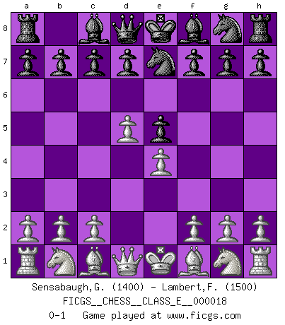 Last move : 0-1 2006 December 10 23:50:22 [Event "FICGS__CHESS__CLASS_E__000018"] [Site "FICGS"] [Date "2006.10.17"] [Round "1"] [White "Sensabaugh,Gene"] [Black "Lambert,Frederic"] [Result "0-1"] [WhiteElo "1400"] [BlackElo "1500"] 1.e4 Nc6 2.d4 e5 3.d5 Nce7 0-1 This chess game has been lost on time (started : 2006.10.17 5:26:11) KP : Nimzovich defense Player Black won this chess game. Follow this game move after move (download)A good player is always lucky. (Jose Raul Capablanca) Drei Punkte vor allen anderen ist wie einer, der im weißen Anzug posiert, während der Rest in Müllsäcke gekleidet dasteht. (Viktor Kortschnoi) Siempre es mucho mejor sacrificar las piezas de tu oponente. (Savielly Tartakover) Les échecs sont un jeu par leur forme, un art par leur essence et une science par sa difficulté d'acquisition. Ils peuvent vous procurer autant de plaisir qu'un bon livre ou une belle musique, mais vous n'aurez une réelle joie que si vous arrivez à bien jouer. (Tigran Petrosian) Art is the triumph over chaos. (John Cheever)