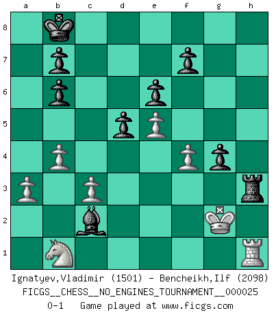 Last move : 0-1 2010 February 18 23:5:1 [Event "FICGS__CHESS__NO_ENGINES_TOURNAMENT__000025"] [Site "FICGS"] [Date "2010.01.30"] [Round "1"] [White "Ignatyev,Vladimir"] [Black "Bencheikh,Ilf"] [Result "0-1"] [WhiteElo "1501"] [BlackElo "2098"] 1.e4 e6 2.f4 d5 3.e5 c5 4.c3 Nc6 5.Bd3 Nh6 6.Bc2 Bd7 7.Nf3 Qb6 8.d3 Be7 9.O-O O-O-O 10.b3 Kb8 11.Be3 Nf5 12.Bf2 h5 13.Nbd2 Qa5 14.Nb1 Rdg8 15.d4 g6 16.Qd2 Rc8 17.dxc5 Bxc5 18.b4 Bxf2+ 19.Qxf2 Qb6 20.Qxb6 axb6 21.a3 Ncd4 22.Bxf5 Nxf5 23.Rc1 Rc4 24.g3 Rhc8 25.Nfd2 Rd4 26.Nb3 Rd3 27.Ra2 Ba4 28.Rd2 Re3 29.Nd4 Re4 30.Nxf5 gxf5 31.Kf2 h4 32.Re2 hxg3+ 33.hxg3 Rxe2+ 34.Kxe2 Rh8 35.Kf3 Rh2 36.g4 Rh3+ 37.Kg2 fxg4 38.Rh1 Bc2 0-1 Ilf Bencheikh Thanks for the game... I think 21.a3 misses the opportunity to equalize... French : Labourdonnais variation Kingside Castling by player White (move 9) Queenside Castling by player Black (move 9) Player Black won this chess game. Follow this game move after move (download)My God, Bobby Fischer plays so simply. (Alexei Suetin) Ich verachte Kasparow. (Viktor Kortschnoi) Fischer deseaba darle a los Rusos una sopa de su propia medicina. (Larry Evans) Donnez-moi un Cavalier en 6e et je gagnerais toutes mes parties. (Steinitz) The project of the man are lower than those of the sky. (Chinese proverb)