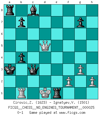 Last move : 0-1 2010 March 10 0:14:56 [Event "FICGS__CHESS__NO_ENGINES_TOURNAMENT__000025"] [Site "FICGS"] [Date "2010.01.30"] [Round "1"] [White "Cirovic,Zeljko"] [Black "Ignatyev,Vladimir"] [Result "0-1"] [WhiteElo "1623"] [BlackElo "1501"] 1.e4 e5 2.Nf3 d6 3.d4 f5 4.dxe5 fxe4 5.Ng5 d5 6.e6 Nh6 7.Nc3 c6 8.Nxh7 Rxh7 9.Qh5+ Ke7 10.Bxh6 Rxh6 11.Qf7+ Kd6 12.Nxe4+ Ke5 13.O-O-O Kxe4 14.g3 Qf6 15.Re1+ Kd4 16.c3+ Kc5 17.Qc7 a5 18.a3 Na6 19.b4+ axb4 20.cxb4+ Nxb4 21.axb4+ Kxb4 22.Qb6+ Ka4 23.Kc2 Bb4 24.Bb5+ cxb5 25.Ra1+ Ba3 26.Rxa3+ Kxa3 27.Qd6+ b4 28.Rb1 Qc3+ 29.Kd1 Rxe6 30.Qxd5 Re1+ 0-1 Ilf Bencheikh Why not 10.Bg5+? Philidor : Philidor counter-gambit, del Rio attack Queenside Castling by player White (move 13) Player Black won this chess game. Follow this game move after move (download)Of Chess it has been said that life is not long enough for it, but that is the fault of life, not Chess. (William Ewart Napier) Mit Schach schule ich mein Gefühl für Geometrie, was für Tennis und Schach gleichermaßen wichtig ist. (Boris Becker) Algunos sacrificios son sólidos, los demás son míos. (Mikhail Tal) On n'a jamais que l'âge auquel on a commence à jouer aux échecs car après on cesse de vieillir. (Capablanca) You lose, general Kenobi. (General Grievous in Star Wars ep.3)