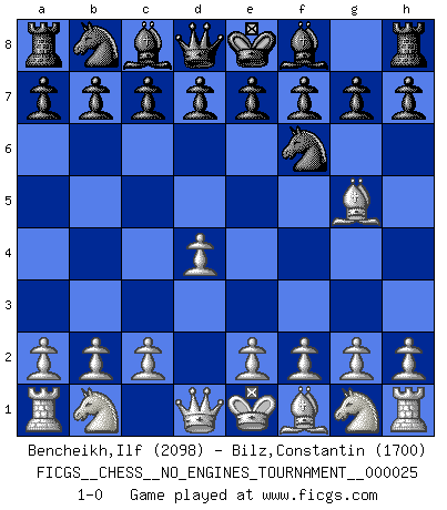 Last move : 1-0 2010 March 11 21:51:42 [Event "FICGS__CHESS__NO_ENGINES_TOURNAMENT__000025"] [Site "FICGS"] [Date "2010.01.30"] [Round "1"] [White "Bencheikh,Ilf"] [Black "Bilz,Constantin"] [Result "1-0"] [WhiteElo "2098"] [BlackElo "1700"] 1.d4 Nf6 2.Bg5 1-0 This chess game has been lost on time (started : 2010.01.30 2:54:43) Trompowsky attack (Ruth, Opovcensky Opening) Player White won this chess game. Follow this game move after move (download)Who is your opponent tonight, tonight I am playing against the Black pieces. (Akiba Rubinstein) Zu meiner Zeit war ein 20 jähriger ein junger Spieler, heute ist er ein Veteran. (Garry Kasparov) Si pudieramos observar el interior de la cabeza de un jugador de Ajedrez, encontraríamos ahí un mundo lleno de sentimientos, imágenes, ideas, emoción y pasión. (Alfred Binet) La vérité est comme le meilleur coup aux échecs : elle existe, mais il faut la chercher. (Arturo Perez-Reverte) If you know the enemy and know yourself you need not fear the results of a hundred battles. (Sun Tzu)