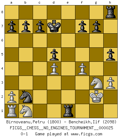 Last move : 0-1 2010 February 25 16:22:59 [Event "FICGS__CHESS__NO_ENGINES_TOURNAMENT__000025"] [Site "FICGS"] [Date "2010.01.30"] [Round "1"] [White "Birnoveanu,Petru"] [Black "Bencheikh,Ilf"] [Result "0-1"] [WhiteElo "1800"] [BlackElo "2098"] 1.e4 e6 2.d4 d5 3.exd5 exd5 4.Bd3 Nc6 5.c3 Bd6 6.f4 Qh4+ 7.g3 Qe7+ 8.Qe2 Bg4 9.Qxe7+ Ngxe7 10.h3 Bf5 11.Bxf5 Nxf5 12.Ne2 h5 13.b4 Kd7 14.Kf2 Rae8 15.Re1 Bxb4 16.cxb4 Nxb4 17.Bb2 Nd3+ 18.Kf1 Nxg3+ 19.Nxg3 Rxe1+ 20.Kg2 Nxb2 0-1 French : Exchange variation Player Black won this chess game. Follow this game move after move (download)When the Chess game is over, the Pawn and the King go back to the same box. (Irish saying) Ich bewundere Kasparows phantasievolle Angriffssiege aus den Achtzigern und Neunzigern, aber wenn man sie mit dem Computer überprüft, nimmt der Computer in jeder zweiten Partie die Opfer an, verteidigt sich und gewinnt. (Vladimir Kramnik) Un entendimiento minucioso de las típicas continuaciones de mate hacen de las mas complicadas combinaciones de sacrificio que conducen hacia ellas no solo no dificiles, sino casi un asunto de rutina. (Siegbert Tarrasch) Soyez une menace à chaque fois que vous vous asseyez pour jouer. (Ken Smith) As a goal marker shodan is important. As a destination it is a poor place to stop. (Thomas Tamayo)