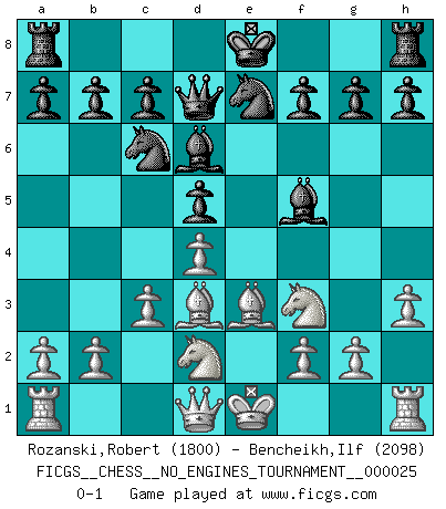 Last move : 0-1 2010 March 11 21:51:42 [Event "FICGS__CHESS__NO_ENGINES_TOURNAMENT__000025"] [Site "FICGS"] [Date "2010.01.30"] [Round "1"] [White "Rozanski,Robert"] [Black "Bencheikh,Ilf"] [Result "0-1"] [WhiteElo "1800"] [BlackElo "2098"] 1.e4 e6 2.d4 d5 3.exd5 exd5 4.Bd3 Nc6 5.Nf3 Bg4 6.c3 Bd6 7.Be3 Qd7 8.Nbd2 Nge7 9.h3 Bf5 0-1 This chess game has been lost on time (started : 2010.01.30 2:54:43) French : Exchange variation Player Black won this chess game. Follow this game move after move (download)Chess is the art of analysis. (Mikhail Botvinnik) Ihnen, Herr Lasker, habe ich nur drei Worte zu sagen: Schach und matt. (Siegbert Tarrasch) El sobresalir en el Ajedrez es un signo de una mente intrigante. (Sir Arthur Conan Doyle) Tous ces prétendus hommes politiques sont les pions, les Cavaliers, les Tours ou les Fous d'une partie d'échecs qui se jouera tant qu'un hasard ne renversera pas l'échiquier. (Honoré de Balzac) A generalist learns less and less about more and more until he knows nothing about everything. (Author unknown)