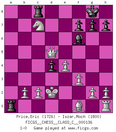 Last move : 1-0 2010 April 19 15:38:24 [Event "FICGS__CHESS__CLASS_C__000136"] [Site "FICGS"] [Date "2010.01.30"] [Round "1"] [White "Price,Eric"] [Black "Iszar,Moch"] [Result "1-0"] [WhiteElo "1726"] [BlackElo "1800"] 1.e4 c5 2.Nf3 Nc6 3.d4 cxd4 4.Nxd4 Nf6 5.Nc3 e5 6.Ndb5 d6 7.Bg5 a6 8.Na3 Be7 9.Nc4 O-O 10.a4 Bg4 11.f3 Be6 12.Bxf6 Bxf6 13.Nd5 Bxd5 14.Qxd5 Nd4 15.O-O-O b5 16.Nxd6 Qc7 17.Rxd4 exd4 18.axb5 axb5 19.Nxb5 Ra1+ 20.Kd2 Rc8 21.Nxc7 1-0 Sicilian : Pelikan (Lasker/Sveshnikov) variation Kingside Castling by player Black (move 9) Queenside Castling by player White (move 15) Player White won this chess game. Follow this game move after move (download)A bad day of Chess is better than any good day at work. (Anonymous) Sitze auf Deine Hände. (Siegbert Tarrasch) No hay precio que no valga la pena por la cabellera del Rey enemigo. (Koblentz) Les échecs, c'est la lutte contre l'erreur. (Johannes Zukertort) Wisdom doesn't necessarily come with age. Sometimes age just shows up all by itself. (Tom Watson)