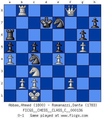 Last move : 0-1 2010 July 6 21:21:20 [Event "FICGS__CHESS__CLASS_C__000136"] [Site "FICGS"] [Date "2010.01.30"] [Round "1"] [White "Abbas,Ahmed"] [Black "Romanazzi,Dante"] [Result "0-1"] [WhiteElo "1800"] [BlackElo "1783"] 1.e4 e5 2.Nf3 d6 3.Bc4 c6 4.Nc3 Bg4 5.h3 Bh5 6.d3 Qf6 7.g4 Bg6 8.Bg5 Qxf3 9.Qxf3 f6 10.Be3 Ne7 11.O-O-O a5 12.a4 Nd7 13.d4 Nb6 14.Bb3 Nbc8 15.dxe5 dxe5 16.h4 Bf7 17.Bxf7+ Kxf7 18.Rd8 g6 19.Rhd1 Bg7 20.g5 Rxd8 21.Rxd8 Ra6 22.gxf6 Bxf6 23.Bg5 c5 24.Rd7 Ke8 25.Rxb7 Bxg5+ 26.hxg5 Nd6 27.Rb8+ Kd7 28.Qf8 Nc4 0-1 This chess game has been lost on time (started : 2010.01.30 14:45:32) Philidor's defense Queenside Castling by player White (move 11) Player Black won this chess game. Follow this game move after move (download)Bobby Fischer is the greatest Chess genius of all time ! (Alexander Kotov) Ich hatte Zahnschmerzen im ersten Spiel. In der zweiten Partie tat mir der Kopf weh. In der dritten war es eine Rheuma-Attacke und während der vierten fühlte ich mich nicht gut. Und in der fünften? Nun, man muss doch nicht jedes Spiel gewinnen, oder? (Savielly Grigorievitsch Tartakower) El hombre es un frívolo, una creatura engañosa y como un jugador de Ajedrez, se preocupa mas por el proceso de obtener su meta que de la meta por sí misma. (Dostoyevsky) Ce qui caractérise les parties de combat, c'est que si le défenseur a constamment de difficiles problèmes à résoudre, l'attaquant doit chercher sans relâche de nouvelles possibilités d'attaque. (Koblentz) When a man with money meets a man with experience, the man with experience leaves with money and the man with money leaves with experience. (Anonymous)