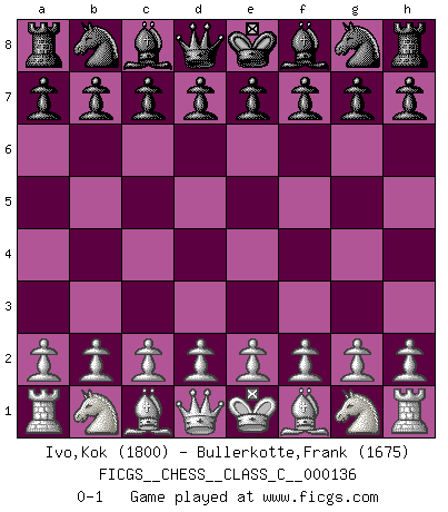 Last move : 0-1 2010 March 11 21:51:42 [Event "FICGS__CHESS__CLASS_C__000136"] [Site "FICGS"] [Date "2010.01.30"] [Round "1"] [White "Ivo,Kok"] [Black "Bullerkotte,Frank"] [Result "0-1"] [WhiteElo "1800"] [BlackElo "1675"] 0-1 This chess game has been lost on time (started : 2010.01.30 14:45:32) Player Black won this chess game. Follow this game move after move (download)Man is a frivolous, a specious creature, and like a Chess player, cares more for the process of attaining his goal than for the goal itself. (Dostoyevsky) Wenn Dein Gegner dir ein Remis anbietet, versuch herauszufinden, weshalb er glaubt schlechter zu stehen. (Nigel Short) El Ajedrez es tan inspirador que yo no creo que un buen jugador sea capaz de tener un pensamiento malo durante una partida. (Wilhelm Steinitz) Il vaut mieux sacrifier les pièces de l'adversaire. (Xavier Tartacover) It's only after you lost everything, Tyler says, that you're free to do anything. (Chuck Palahniuk, Fight Club)