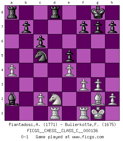 Last move : 0-1 2010 February 20 0:1:43 [Event "FICGS__CHESS__CLASS_C__000136"] [Site "FICGS"] [Date "2010.01.30"] [Round "1"] [White "Piantadosi,Angelo"] [Black "Bullerkotte,Frank"] [Result "0-1"] [WhiteElo "1771"] [BlackElo "1675"] 1.Nf3 d5 2.g3 Nf6 3.Bg2 c6 4.O-O Bg4 5.d3 Nbd7 6.Nbd2 e5 7.e4 dxe4 8.Nxe4 Nxe4 9.dxe4 Bc5 10.Qd3 Qe7 11.Qc3 O-O 12.Be3 Bxe3 13.Qxe3 a5 14.Nd2 Rfd8 15.f3 Be6 16.Rad1 Bxa2 17.b3 a4 18.bxa4 Qc5 19.Qxc5 Nxc5 0-1 Reti : King's Indian attack, Yugoslav variation Kingside Castling by player White (move 4) Kingside Castling by player Black (move 11) Player Black won this chess game. Follow this game move after move (download)Fischer Chess play was always razor-sharp, rational and brilliant. One of the best ever. (Dave Regis) Wenn du gegen Bobby spielst, ist es keine Frage von gewinnen oder verlieren. Es ist eine Frage des Überlebens. (Boris Vassilievich Spassky) Combinaciones deslumbrantes son para la mayoría, mover madera es para los pocos. (Georg Kieninger) Tous ces prétendus hommes politiques sont les pions, les Cavaliers, les Tours ou les Fous d'une partie d'échecs qui se jouera tant qu'un hasard ne renversera pas l'échiquier. (Honoré de Balzac) It is not true that people stop pursuing dreams because they grow old, they grow old because they stop pursuing dreams. (Gabriel Garcia Marquez)