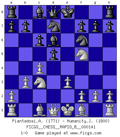 Last move : 1-0 2010 March 11 9:50:53 [Event "FICGS__CHESS__RAPID_B__000141"] [Site "FICGS"] [Date "2010.01.30"] [Round "1"] [White "Piantadosi,Angelo"] [Black "Humanity,Jaggu"] [Result "1-0"] [WhiteElo "1771"] [BlackElo "1800"] 1.c4 c6 2.Nc3 Nf6 3.b3 d5 4.e3 e5 5.Nf3 Bd6 6.d4 exd4 7.Nxd4 Nbd7 8.Nf5 1-0 This chess game has been lost on time (started : 2010.01.30 14:46:7) English : Caro-Kann defensive system Player White won this chess game. Follow this game move after move (download)An attack on the wing should be met by play in the center. (Nimzovitch) Frage: Wie viele Autos haben Sie schon zerstört? - Antwort: Nur zwei. (Loek van Wely) Los problemas de Ajedrez exigen del compositor las mismas virtudes que caracterizan todo el arte de valor: originalidad, invención, concisión, armonía, complejidad e insinceridad explendida. (Vladimir Nabokov) Un journaliste : 'Vous préférez avoir une dame de plus sur l'échiquier ou au lit ?' Boris Spassky : 'Ca dépend de la position.' A clear conscience is usually the sign of a bad memory. (Unknown)