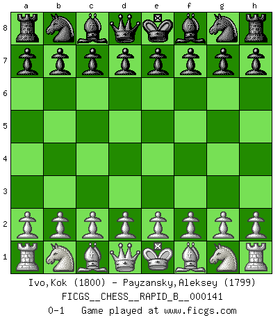 Last move : 0-1 2010 March 1 21:35:23 [Event "FICGS__CHESS__RAPID_B__000141"] [Site "FICGS"] [Date "2010.01.30"] [Round "1"] [White "Ivo,Kok"] [Black "Payzansky,Aleksey"] [Result "0-1"] [WhiteElo "1800"] [BlackElo "1799"] 0-1 This chess game has been lost on time (started : 2010.01.30 14:46:7) Player Black won this chess game. Follow this game move after move (download)Up to this point White has been following well-known analysis. But now he makes a fatal error: he begins to use his own head. (Siegbert Tarrasch) Es gibt Leute, die glauben, alles wäre vernünftig, was man mit einem ernsthaften Gesicht tut. (Georg Christoph Lichtenberg) Un mal día en el Ajedrez, es mejor que cualquier buen día en el trabajo. (Anonymous) Toutes choses étant égales, c'est la conviction qui gagne. Alliée à une volonté de vaincre, elle sert de détonateur, suscite des idées, disperse les doutes et aide à penser clairement. (Robert Fischer) You must do what you feel is right... of course. (Obi-Wan Kenobi in Star Wars ep.4)