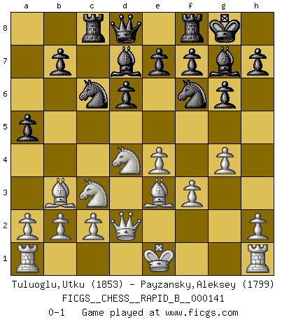 Last move : 0-1 2010 March 13 21:53:26 [Event "FICGS__CHESS__RAPID_B__000141"] [Site "FICGS"] [Date "2010.01.30"] [Round "1"] [White "Tuluoglu,Utku"] [Black "Payzansky,Aleksey"] [Result "0-1"] [WhiteElo "1853"] [BlackElo "1799"] 1.e4 c5 2.Nf3 d6 3.d4 cxd4 4.Nxd4 Nf6 5.Nc3 g6 6.Be3 Bg7 7.f3 O-O 8.Qd2 Nc6 9.Bc4 Bd7 10.g4 Rc8 11.Bb3 a5 0-1 This chess game has been lost on time (started : 2010.01.30 14:46:7) Sicilian : Dragon, Yugoslav attack, 7...O-O Kingside Castling by player Black (move 7) Player Black won this chess game. Follow this game move after move (download)Becoming successful at Chess allows you to discover your own personality. That's what I want for the kids I teach. (Saudin Robovic) Matt entspricht nicht immer den Tatsachen. (Savielly Grigorievitsch Tartakower) EL Ajedrez es como la vida. (Boris Spassky) Si rien de grave n'est détecté lors de l'analyse d'une position, on joue alors le coup. Seconde règle de Blumenfeld. Have no fear of perfection - you'll never reach it. (Salvador Dali)