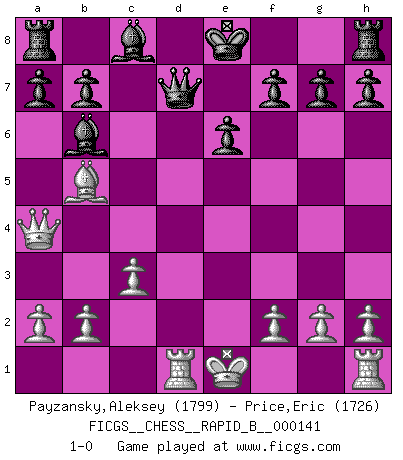 Last move : 1-0 2010 February 12 21:44:28 [Event "FICGS__CHESS__RAPID_B__000141"] [Site "FICGS"] [Date "2010.01.30"] [Round "1"] [White "Payzansky,Aleksey"] [Black "Price,Eric"] [Result "1-0"] [WhiteElo "1799"] [BlackElo "1726"] 1.e4 e6 2.d4 d5 3.Nc3 dxe4 4.Nxe4 Nd7 5.Nf3 Ngf6 6.Bg5 Be7 7.Bxf6 Nxf6 8.Nxf6+ Bxf6 9.Bd3 c5 10.c3 cxd4 11.Nxd4 Bxd4 12.Qa4+ Qd7 13.Bb5 Bb6 14.Rd1 1-0 French : Rubinstein variation Player White won this chess game. Follow this game move after move (download)No Chess Grandmaster is normal; they only differ in the extent of their madness. (Viktor Korchnoi) Ein Gewinn durch eine ungenaue Kombination, sei sie auch noch so vorzeigbar, erfüllt mich mit Schaudern. (Wilhelm Steinitz) Observen a Garry Kasparov. Después de una derrota, invariablemente el gana la próxima partida. Prácticamente hace pedazos a su siguiente oponente. Eso es algo que tenemos que aprender a lograr. (Maurice Ashley) Je menace de comprendre la position. (Anonyme) If everyone is thinking alike, then somebody isn't thinking. (US General George S. Patton)