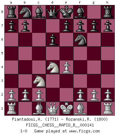 Last move : 1-0 2010 March 7 21:40:26 [Event "FICGS__CHESS__RAPID_B__000141"] [Site "FICGS"] [Date "2010.01.30"] [Round "1"] [White "Piantadosi,Angelo"] [Black "Rozanski,Robert"] [Result "1-0"] [WhiteElo "1771"] [BlackElo "1800"] 1.e4 c5 2.Nf3 d6 3.d4 cxd4 4.Nxd4 Nf6 5.Nc3 1-0 This chess game has been lost on time (started : 2010.01.30 14:46:7) Sicilian Player White won this chess game. Follow this game move after move (download)If I win a tournament, I win it by myself. I do the playing. Nobody helps me. (Bobby Fischer) Alle offensichtlichen Züge sehen nach dem Spiel in der Analyse verdächtig aus. (Viktor Kortschnoi) En posiciones complicadas, Bobby Fischer pocas veces tuvo que temer de cualquiera. (Paul Keres) A ce moment-là, je menaçais de comprendre la position ! (Clément L'Heureux) The only difference between a tax man and a taxidermist is that the taxidermist leaves the skin. (Mark Twain)