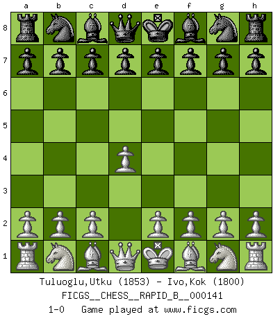 Last move : 1-0 2010 March 1 21:35:23 [Event "FICGS__CHESS__RAPID_B__000141"] [Site "FICGS"] [Date "2010.01.30"] [Round "1"] [White "Tuluoglu,Utku"] [Black "Ivo,Kok"] [Result "1-0"] [WhiteElo "1853"] [BlackElo "1800"] 1.d4 1-0 This chess game has been lost on time (started : 2010.01.30 14:46:7) Queen's pawn Player White won this chess game. Follow this game move after move (download)My style is somewhere between that of Tal and Petrosian. (Reshevsky) Moralische Siege zählen nicht. (Savielly Grigorievitsch Tartakower) Desconfianza es la característica mas necesaria de un jugador de Ajedrez. (Siegbert Tarrasch) Mon pion favori sur ma case favorite ! Bronstein en parlant d'un coup de pion en h5 quand il avait les Noirs. All art requires courage. (Anne Tucker)