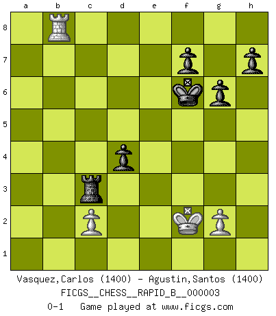Last move : 0-1 2006 July 29 3:10:28 [Event "FICGS__CHESS__RAPID_B__000003"] [Site "FICGS"] [Date "2006.04.23"] [Round "1"] [White "Vasquez,Carlos"] [Black "Agustin,Santos"] [Result "0-1"] [WhiteElo "1400"] [BlackElo "1400"] 1.e4 e5 2.Nf3 Nc6 3.Bc4 Nf6 4.Nc3 Bc5 5.a3 O-O 6.O-O d6 7.h3 a6 8.d3 b5 9.Ba2 Nd4 10.Nxd4 Bxd4 11.Be3 Bxe3 12.fxe3 c6 13.b4 Re8 14.Qf3 a5 15.bxa5 Re7 16.Qg3 Rea7 17.d4 exd4 18.exd4 Rxa5 19.e5 dxe5 20.dxe5 Nd5 21.Nxd5 cxd5 22.Bb3 Rxa3 23.Rxa3 Rxa3 24.Qf3 Be6 25.Qe2 Qb6+ 26.Kh1 g6 27.Rb1 d4 28.Bxe6 Qxe6 29.Rxb5 Qc6 30.Rb8+ Kg7 31.Qf2 Rxh3+ 32.Kg1 Re3 33.Qf6+ Qxf6 34.exf6+ Kxf6 35.Kf2 Rc3 0-1 This chess game has been lost on time (started : 2006.04.23 16:33:7) Two knights defense Kingside Castling by player Black (move 5) Kingside Castling by player White (move 6) 10 pieces endgame at move 34 : White KRPP , Black KRPPPP WHITE : King + 1 Rook 2 Pawns BLACK : King + 1 Rook 4 Pawns Player Black won this chess game. Follow this game move after move (download)You are for me the Queen on d8 and I am the Pawn on d7 !! (Eduard Gufeld) Der zweitbeste Zug ist oft der einzig richtige. (Savielly Grigorievitsch Tartakower) Una victoria por una combinación errónea, aunque sea espectacular, me llena de horror artístico. (Wilhelm Steinitz) Si rien de grave n'est détecté lors de l'analyse d'une position, on joue alors le coup. Seconde règle de Blumenfeld. Beta. Software undergoes beta testing shortly before it's released. Beta is latin for still doesn't work. (Anonymous)
