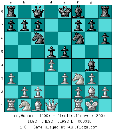 Last move : 1-0 2006 December 6 11:12:45 [Event "FICGS__CHESS__CLASS_E__000018"] [Site "FICGS"] [Date "2006.10.17"] [Round "1"] [White "Leo,Hanson"] [Black "Cirulis,Ilmars"] [Result "1-0"] [WhiteElo "1400"] [BlackElo "1200"] 1.g3 Nc6 2.Bg2 d5 3.a3 e5 4.Nh3 Nf6 5.e3 Bf5 6.O-O Qc8 7.Ng5 h6 8.Nf3 Bg4 9.d4 1-0 This chess game has been lost on time (started : 2006.10.17 5:26:11) Benko's Opening Kingside Castling by player White (move 6) Player White won this chess game. Follow this game move after move (download)Chess is the art which expresses the science of logic. (Mikhail Botvinnik) Korrekt heißt in Deutschland die Haltung eines Mannes, dessen Benehmen nach dem Urteile seiner Nachbarn seiner Stellung angemessen ist. Um korrekt zu sein, muß man sich der Meinung der anderen anpassen... (Emanuel Lasker) Fischer deseaba darle a los Rusos una sopa de su propia medicina. (Larry Evans) Nous sommes les pions de la mystérieuse partie d'Echecs jouée par Dieu. Il nous déplace, nous arrête, nous pousse encore, puis nous lance un à un dans la boîte du Néant. Epitaphe sur la tombe de David Janowsky (1868-1927). I have opinions of my own - strong opinions - but I don't always agree with them. (George Bush)