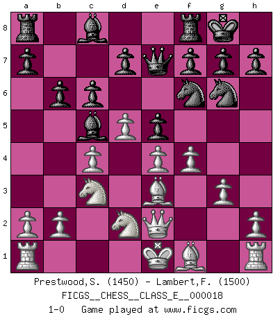 Last move : 1-0 2007 February 24 23:45:41 [Event "FICGS__CHESS__CLASS_E__000018"] [Site "FICGS"] [Date "2006.10.17"] [Round "1"] [White "Prestwood,Scott"] [Black "Lambert,Frederic"] [Result "1-0"] [WhiteElo "1450"] [BlackElo "1500"] 1.e4 Nc6 2.d4 e5 3.d5 Nce7 4.c4 Ng6 5.Be3 Bb4+ 6.Nd2 Nf6 7.f3 Qe7 8.Ne2 O-O 9.g3 b6 10.Nc3 Bc5 11.Qe2 c6 12.f4 1-0 KP : Nimzovich defense Kingside Castling by player Black (move 8) Player White won this chess game. Follow this game move after move (download)If I win a tournament, I win it by myself. I do the playing. Nobody helps me. (Bobby Fischer) Ich würde die 30 stärksten Spieler der USA im Simultanspiel besiegen. (José Raúl Capablanca) Nos gusta pensar. (Gary Kasparov) Il vaut mieux sacrifier les pièces de l'adversaire. (Xavier Tartacover) Depression is just anger without enthusiasm. (Unknown)