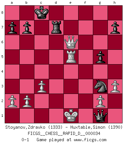 Last move : 0-1 2010 February 19 21:55:26 [Event "FICGS__CHESS__RAPID_D__000034"] [Site "FICGS"] [Date "2010.01.31"] [Round "1"] [White "Stoyanov,Zdravko"] [Black "Huxtable,Simon"] [Result "0-1"] [WhiteElo "1333"] [BlackElo "1390"] 1.e4 c6 2.Nf3 d5 3.e5 Bg4 4.Be2 e6 5.d4 Nd7 6.h3 Bh5 7.c3 c5 8.Be3 cxd4 9.Bxd4 Bxf3 10.Bxf3 Bc5 11.Nd2 Qc7 12.Nb3 Bb6 13.O-O Nxe5 14.Bxe5 Qxe5 15.Re1 Qf6 16.Nd4 Qe7 17.Bxd5 Qd7 18.Qf3 O-O-O 19.Bc4 Bxd4 20.Rad1 Bxf2+ 21.Kxf2 Qc7 22.Qg4 Qc5+ 23.Kf1 Nh6 24.Qf4 g5 25.Qe4 Nf5 26.Rxd8+ Rxd8 27.Bxe6+ fxe6 28.Qxe6+ Rd7 29.Re5 Ng3+ 30.Ke1 Qg1+ 0-1 Caro-Kann defense Kingside Castling by player White (move 13) Queenside Castling by player Black (move 18) Player Black won this chess game. Follow this game move after move (download)It is no time to be playing Chess when the house is on fire. (Italian Proverb) Karpov ist ein Museumsstück. (Garry Kasparov) Desconfianza es la característica mas necesaria de un jugador de Ajedrez. (Siegbert Tarrasch) Les Echecs ne sont pas pour les âmes timides. Ils requièrent un homme entier, qui ne s'arrête pas aveuglément à ce qui a été déjà établi, mais qui tente individuellement de sonder les profondeurs du jeu. (W. Steinitz) Rules and bones are meant to be broken. (Anonymous)
