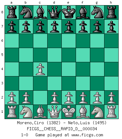 Last move : 1-0 2010 March 3 9:34:55 [Event "FICGS__CHESS__RAPID_D__000034"] [Site "FICGS"] [Date "2010.01.31"] [Round "1"] [White "Moreno,Ciro"] [Black "Neto,Luis"] [Result "1-0"] [WhiteElo "1382"] [BlackElo "1495"] 1.c4 1-0 This chess game has been lost on time (started : 2010.01.31 23:24:56) English Opening Player White won this chess game. Follow this game move after move (download)Bobby is the finest Chess player this country ever produced. His memory for the moves, his brilliance in dreaming up combinations, and his fierce determination to win are uncanny. (John Collins) Ein Schachspiel besteht aus drei Phasen: Die erste, wenn du hofftst den Vorteil zu haben, die zweite, wenn du glaubst einen Vorteil zu haben, und die dritte.... wenn du weißt Du wirst verlieren. (Savielly Grigorievitsch Tartakower) Tu puedes aprender mucho mas de una partida que pierdas que de una partida ganada. Tendras que perder cientos de partidas antes de llegar a ser un buen jugador. (Jose Raul Capablanca) Mais n'est-ce pas déjà le limiter injurieusement que d'appeler les échecs un jeu? N'est-ce pas aussi une science, un art, ou quelque chose qui, comme le cercueil de Mahomet entre ciel et terre, est suspendu entre l'un et l'autre, et qui réunit un nombre incroyable de contraires ? (Stefan Zweig) After growing wildly for years, the field of computing appears to be reaching its infancy. (John Pierce)