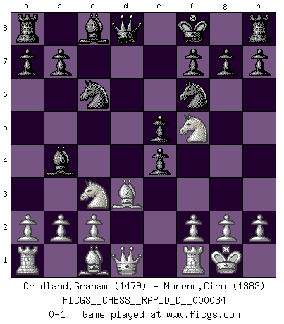 Last move : 0-1 2010 February 18 9:35:43 [Event "FICGS__CHESS__RAPID_D__000034"] [Site "FICGS"] [Date "2010.01.31"] [Round "1"] [White "Cridland,Graham"] [Black "Moreno,Ciro"] [Result "0-1"] [WhiteElo "1479"] [BlackElo "1382"] 1.e4 c5 2.Nf3 Nc6 3.d4 cxd4 4.Nxd4 Nf6 5.Nc3 e5 6.Ndb5 Bb4 7.Nd6+ Ke7 8.Nf5+ Kf8 9.Bd3 d5 10.O-O dxe4 0-1 Sicilian : Pelikan (Lasker/Sveshnikov) variation Kingside Castling by player White (move 10) Player Black won this chess game. Follow this game move after move (download)You know, comrade Pachman, I don't enjoy being a Minister, I would rather play Chess like you. (Che Guevara) Ich organisiere ein großes Turnier, was mich etwa 120000 Dollar kostet. Ich denke, das ist das erste Mal in der Schachgeschichte, daß ein Schachgroßmeister auch als Mäzen auftritt. (Miguel Najdorf) Dejen al perfeccionista jugar por correo. (Yasser Seirawan) Vous m'avez demandé de vous exposer quel est le fondement de la prière. Je ne fais que préparer les pièces du jeu sur la table... Nous sera-t-il permis d'en adopter les règles et si nous les appliquons scrupuleusement nous ne tarderons pas à faire mat le Roi divin ! Il ne pourra échapper à nos mains. (Sainte Thérèse d'Avila, Chemin de perfection) A clear conscience is usually the sign of a bad memory. (Unknown)
