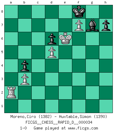 Last move : 1-0 2010 June 3 20:24:41 [Event "FICGS__CHESS__RAPID_D__000034"] [Site "FICGS"] [Date "2010.01.31"] [Round "1"] [White "Moreno,Ciro"] [Black "Huxtable,Simon"] [Result "1-0"] [WhiteElo "1382"] [BlackElo "1390"] 1.c4 e5 2.Nc3 f5 3.e4 Nf6 4.exf5 Bc5 5.g4 O-O 6.Bg2 d6 7.d3 Nc6 8.Bg5 Nd4 9.Ne4 c6 10.Nxf6+ gxf6 11.Bd2 Kh8 12.Kf1 Rg8 13.h3 Re8 14.Ne2 Rg8 15.Be3 Qb6 16.Rb1 Bd7 17.b4 Nxe2 18.Qxe2 a5 19.b5 a4 20.Bh6 cxb5 21.h4 b4 22.g5 Qc7 23.Bd5 Bc6 24.gxf6 Bxd5 25.cxd5 Qf7 26.Bg7+ Rxg7 27.fxg7+ Qxg7 28.Rg1 Qe7 29.Qh5 b3 30.axb3 a3 31.Ra1 e4 32.Qg4 exd3 33.Ra2 Re8 34.Rg3 Qe1+ 35.Kg2 Qe4+ 36.Qxe4 Rxe4 37.f6 Rf4 38.h5 b5 39.Rxd3 Rxf6 40.Rf3 Rxf3 41.Kxf3 Kg7 42.Kg4 Kf6 43.Kf4 b4 44.Ke4 Kg5 45.f4+ Kxh5 46.Kf5 Kh6 47.Rh2+ Kg7 48.Ke6 Bd4 49.f5 Bb2 50.f6+ Kf8 51.f7 a2 52.Rg2 Bg7 53.Rxa2 1-0 English Opening Kingside Castling by player Black (move 5) 10 pieces endgame at move 53 : White KRPPP , Black KBPPP WHITE : King + 1 Rook 3 Pawns BLACK : King + 1 Bishop 3 Pawns Player White won this chess game. Follow this game move after move (download)For me, Chess is life and every game is like a new life. Every Chess player gets to live many lives in one lifetime. (Eduard Gufeld) Wir können eben der zündenden Macht des Opfers nicht wiederstehen, denn die Begeisterung für das Opfer liegt in der Natur des Menschen. (Rudolf Spielmann) Me gusta decir que Bobby Fischer fue el mejor jugador que jamás haya existido. Pero lo que hizo de Fischer un genio, fue su habilidad de mezclar una frescura y pragmatismo Americano con ideas Rusas acerca de la estrategia. (Bruce Pandolfini) Demandez au pauvre Cg1 ce qu'il en pense. Eduard Gufeld à propos de la variante Saemisch de l'Est-Indienne. Your best chance to get a Royal Flush in a casino is in the bathroom. (Anonymous)