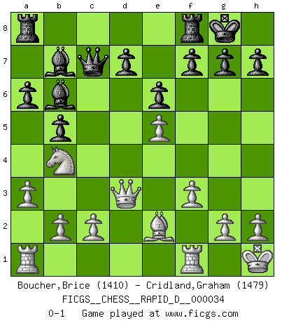 Last move : 0-1 2010 April 3 20:30:31 [Event "FICGS__CHESS__RAPID_D__000034"] [Site "FICGS"] [Date "2010.01.31"] [Round "1"] [White "Boucher,Brice"] [Black "Cridland,Graham"] [Result "0-1"] [WhiteElo "1410"] [BlackElo "1479"] 1.e4 c5 2.Nf3 Nc6 3.d4 cxd4 4.Nxd4 e6 5.Nc3 Qc7 6.Ndb5 Qb8 7.a3 a6 8.Nd4 Qc7 9.Be2 Nf6 10.Be3 b5 11.O-O Bb7 12.f3 Bc5 13.Kh1 Qb6 14.Nxc6 Bxe3 15.Nb4 Qc7 16.Nd3 O-O 17.e5 Nd5 18.Nxd5 Bxd5 19.Nb4 Bb7 20.Qd3 Bb6 0-1 This chess game has been lost on time (started : 2010.01.31 23:24:56) Sicilian defense Kingside Castling by player White (move 11) Kingside Castling by player Black (move 16) Player Black won this chess game. Follow this game move after move (download)When you play Bobby, it is not a question if you win or lose. It is a question if you survive. (Boris Spassky) Capablanka war das größte Genie der Schachgeschichte! Aber denken sie nicht er habe nichts vom Schach verstanden. Er wusste nur soviel wie er wissen musste um seine Ziele zu erreichen. (Mikhail Moiseyevich Botvinik) ¿Cual es el objetivo de jugar una apertura de gambito?... Para adquirir una reputación de ser un jugador apuesto a costo de perder el juego. (Siegbert Tarrasch) Le système Elo représente seulement une moyenne. Il est simplement un indicateur de votre stabilité. (Anatoli Karpov) Life is the sum of all your choices. (Albert Camus)