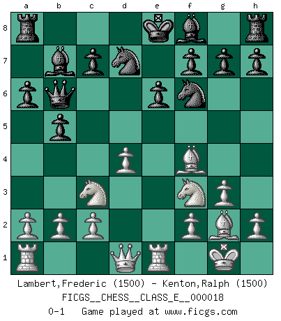 Last move : 0-1 2007 January 28 19:40:56 [Event "FICGS__CHESS__CLASS_E__000018"] [Site "FICGS"] [Date "2006.10.17"] [Round "1"] [White "Lambert,Frederic"] [Black "Kenton,Ralph"] [Result "0-1"] [WhiteElo "1500"] [BlackElo "1500"] 1.e4 d5 2.exd5 Qxd5 3.Nc3 Qd6 4.d4 Nf6 5.Nf3 a6 6.g3 b5 7.Bg2 Bb7 8.O-O Nbd7 9.Bf4 Qb6 10.Re1 e6 0-1 This chess game has been lost on time (started : 2006.10.17 5:26:11) Scandinavian : Pytel-Wade variation Kingside Castling by player White (move 8) Player Black won this chess game. Follow this game move after move (download)Help your pieces so they can help you. (Paul Morphy) Ich tröste mich mit dem Vergnügen, daß Schachfans, Zuschauer und Leser glücklich sind, wenn ein Großmeister etwas riskiert, statt nur Klötzchen zu schieben. (Mikhail Nekhemyevich Tal) Si pudieramos observar el interior de la cabeza de un jugador de Ajedrez, encontraríamos ahí un mundo lleno de sentimientos, imágenes, ideas, emoción y pasión. (Alfred Binet) Horreur, mais aussi harmonie suprême : qu'y avait-il en effet au monde en dehors des échecs ? Le brouillard, l'inconnu, le non-être... (Vladimir Nabokov) There's no money in correspondence chess. (John Knudsen)