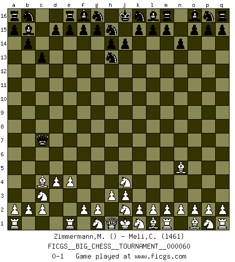 Last move : 0-1 2010 February 10 10:4:19 [Event "FICGS__BIG_CHESS__TOURNAMENT__000060"] [Site "FICGS"] [Date "2010.02.02"] [Round "1"] [White "Zimmermann,Melchior"] [Black "Meli,Cosimo Leonardo"] [Result "0-1"] [WhiteElo ""] [BlackElo "1461"] 1.e2-e4 b15-b14 2.d2-d4 c16-b15 3.c1-k8 c15-c13 4.b1-c3 j15-h13 5.f1-c4 n15-n14 6.h2-j4 h16-k14 7.k8-n5 k14-c7 0-1 Follow this game move after move (download)It's always better to sacrifice your opponent's men. (Savielly Tartakover) Der Vorposten provoziert a) eine Basis für neue Angriffe und b) eine Schwächung der gegnerischen Widerstandskraft in der fraglichen Linie. (Aaron Nimzowitsch) En el Ajedrez, tal como en la vida, las bendiciones de hoy pueden ser el veneno del mañana. (Assaic) Il n'y a plus de joueurs du niveau de Jacob Murray dont la seule quête est le beau jeu, le plaisir de voir les pièces construire quelque chose. Sur 10 idées à la minute, 9 seront sans intérêt, la dernière s'avèrera géniale. (Christian Bauer) There is a very easy way to return from a casino with a small fortune : go there with a large one. (Jack Yelton)