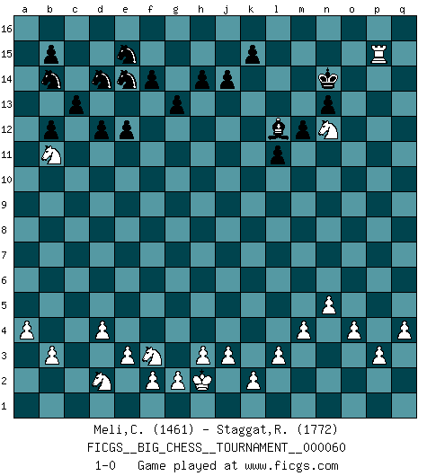 Last move : 1-0 2010 December 10 16:57:3 [Event "FICGS__BIG_CHESS__TOURNAMENT__000060"] [Site "FICGS"] [Date "2010.02.02"] [Round "1"] [White "Meli,Cosimo Leonardo"] [Black "Staggat,Rolf"] [Result "1-0"] [WhiteElo "1461"] [BlackElo "1772"] 1.p2-p3 j15-k13 2.o2-o4 h16-o10 3.j2-h4 o10-c10 4.h2-j4 c10-c2 5.h1-o7 c2-c14 6.p1-o3 c14-f14 7.g1-f3 p16-o14 8.o1-p2 e15-e13 9.m2-m3 d15-d13 10.n2-n4 m15-m13 11.e2-e3 n15-n13 12.d2-d4 l16-p12 13.k1-h2 c16-l8 14.n4-n5 b16-c14 15.o3-p5 a16-d16 16.l1-n3 f16-b12 17.b2-b3 o16-f8 18.c1-a3 g16-e15 19.e1-c1 k16-l14 20.a3-f8 f14-f8 21.f1-c4 l8-m9 22.o7-n6 e15-g14 23.b1-d2 e13-e12 24.n6-a6 e16-e13 25.c4-h9 e13-j13 26.p5-n4 k13-j11 27.h9-l6 a15-a13 28.n4-l3 j16-j15 29.j1-j2 m16-e16 30.d2-c4 e16-e13 31.c4-e5 e13-h13 32.n3-m2 f8-p8 33.l6-m5 m9-o7 34.m5-o7 p8-o7 35.p2-m5 o7-j7 36.l3-k5 j7-m10 37.a6-m6 m10-m6 38.k5-m6 j11-l10 39.m2-b12 a13-b12 40.m5-o7 l14-k12 41.c1-c10 p12-o13 42.m1-c1 h13-h11 43.l2-l3 d16-a16 44.m3-m4 a16-a11 45.c1-c6 q16-a16 46.a2-a4 a11-b11 47.f3-d2 j13-j11 48.c6-j6 a16-a11 49.j6-j11 h11-j11 50.a1-c1 g14-f12 51.c10-f10 g15-g13 52.c1-c10 b11-c11 53.e5-c4 c14-d12 54.c10-c11 a11-c11 55.j4-k6 f15-f14 56.k6-l8 f12-h11 57.f10-d10 c15-c13 58.h2-f3 l10-m8 59.o7-m5 j11-q11 60.f3-g5 h11-g9 61.g5-e6 g9-e8 62.d10-d8 e8-f6 63.e6-c5 m8-n10 64.c4-e5 h15-j13 65.d8-d6 c11-f11 66.m5-f11 q11-f11 67.d6-c6 d12-b11 68.c6-a6 o13-h7 69.a6-a16 f6-d5 70.e5-f3 f11-q11 71.q2-q4 d13-d12 72.q1-p1 h7-a14 73.a16-o16 q11-p11 74.o16-o15 l15-l13 75.o15-o16 j13-h15 76.o16-e16 p11-e11 77.p1-c1 k12-h13 78.m6-n4 h13-g15 79.e16-l16 j15-k14 80.c5-d3 d5-e7 81.c1-c5 e7-d9 82.c5-e5 e11-l11 83.l8-m6 d9-e11 84.e5-l5 l11-l5 85.n4-l5 n10-m12 86.l16-h16 k14-j15 87.h16-l16 l13-l12 88.l16-g16 e11-f13 89.l5-k7 h15-j13 90.d3-e5 j13-g14 91.h4-g6 j15-h15 92.g16-a16 b11-d10 93.e5-d7 f13-d14 94.d7-c9 d10-c12 95.c9-b11 g15-e14 96.g6-h8 g14-e15 97.a16-m16 c12-b14 98.k7-j9 a14-e10 99.m6-k7 e10-g12 100.k7-m8 h15-j15 101.m8-l10 m12-l14 102.m16-q16 l14-n15 103.l10-n11 g12-n6 104.j2-h2 n6-p8 105.h8-k9 m13-m12 106.n11-m9 n15-p16 107.m9-o10 p8-n10 108.k9-m10 l12-l11 109.m10-n12 j15-k14 110.j9-k11 n10-l12 111.k11-l13 k14-l15 112.n12-o14 p16-o14 113.o10-n12 o14-n12 114.l13-n12 l15-m15 115.q16-q15 m15-n14 116.q15-p15 1-0 Follow this game move after move (download)Openings teach you openings. Endgames teach you chess ! (Stephan Gerzadowicz) Der zweitbeste Zug ist oft der einzig richtige. (Savielly Grigorievitsch Tartakower) Yo no creo en la psicología. Yo creo en las buenas movidas. (Bobby Fischer) Karpov est une pièce de musée. (Garry Kasparov) I feel so... helpless. (C-3PO in Star Wars ep.3)
