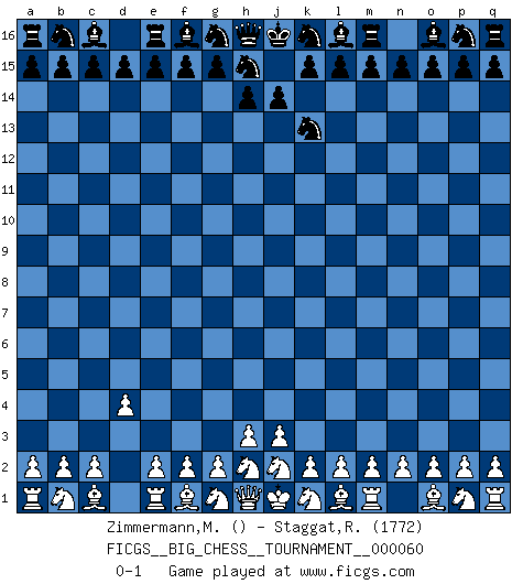 Last move : 0-1 2010 March 1 18:42:15 [Event "FICGS__BIG_CHESS__TOURNAMENT__000060"] [Site "FICGS"] [Date "2010.02.02"] [Round "1"] [White "Zimmermann,Melchior"] [Black "Staggat,Rolf"] [Result "0-1"] [WhiteElo ""] [BlackElo "1772"] 1.d2-d4 j15-k13 0-1 Follow this game move after move (download)Chess is in its essence a game, in its form an art, and in its execution a science. (Baron Tassilo) Schon mancher Spieler hat aufgegeben, um zu vermeiden, daß er eine Figur verliert. (Savielly Grigorievitsch Tartakower) El Ajedrez es tortura mental. (Garry Kasparov) Je fais ceci parce que dans cinquante coups j'obtiendrai cela; je m'appelle Mikhail Moisevitch Botvinnik. (Botvinnik) In fact if nothing is done against this teddy bear, hereby I announce that I would quit chess, rapid chess, blitz chess, postal chess, email chess, server chess and correspondence chess I will then switch to a table game where teddy bears aren't going to be seen for a while, like Poker, or Roulette, all 18+ games. (Elmer Valderrama)
