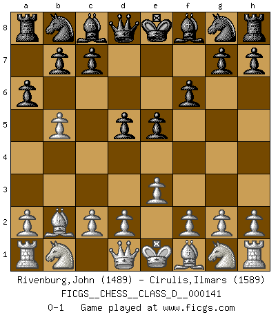 Last move : 0-1 2010 March 20 9:20:40 [Event "FICGS__CHESS__CLASS_D__000141"] [Site "FICGS"] [Date "2010.02.02"] [Round "1"] [White "Rivenburg,John"] [Black "Cirulis,Ilmars"] [Result "0-1"] [WhiteElo "1489"] [BlackElo "1589"] 1.b4 e5 2.Bb2 f6 3.b5 d5 4.e3 a6 0-1 This chess game has been lost on time (started : 2010.02.02 14:33:38) Polish (Sokolsky) opening Player Black won this chess game. Follow this game move after move (download)The way he plays Chess demonstrates a man's whole nature. (Stanley Ellin) Offener Brief an US-Präsident Bush anlässlich der Verhaftung Bobby Fishers: Verhaften Sie mich. Stecken Sie mich in dieselbe Zelle wie Bobby Fisher und geben Sie uns ein Schachspiel mit. (Boris Vassilievich Spassky) En manos de Fischer's, una diminuta ventaja teórica es tan buena como tener una Reina de ventaja. (Isaac Kashdan) Comme les marins qui ont mille raisons différentes d'aller en mer, les joueurs d'échecs en ont tout autant avant de s'installer devant une table et jouer... (Vincent Bertignac, philosophe) Art disturbs, science reassures. (Georges Braque, Le Jour et la Nuit)