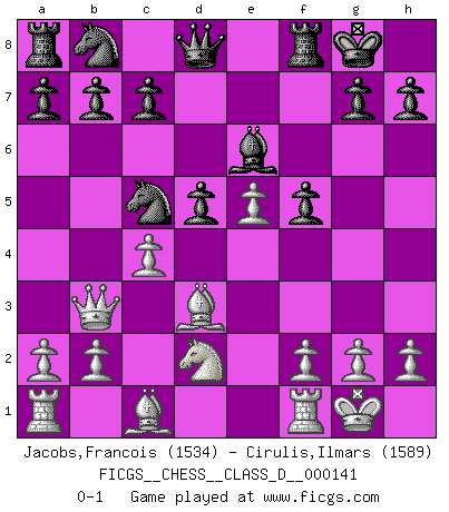 Last move : 0-1 2010 February 11 9:40:9 [Event "FICGS__CHESS__CLASS_D__000141"] [Site "FICGS"] [Date "2010.02.02"] [Round "1"] [White "Jacobs,Francois"] [Black "Cirulis,Ilmars"] [Result "0-1"] [WhiteElo "1534"] [BlackElo "1589"] 1.e4 e5 2.Nf3 Nf6 3.d4 Nxe4 4.Bd3 d5 5.Nxe5 Bd6 6.O-O O-O 7.Nd2 f5 8.c4 Bxe5 9.dxe5 Be6 10.Qb3 Nc5 0-1 Petrov : Modern attack, Symmetrical variation Kingside Castling by player White (move 6) Kingside Castling by player Black (move 6) Player Black won this chess game. Follow this game move after move (download)Let the perfectionist play postal. (Yasser Seirawan) Der Freibauer hat für mich eine Seele, genau wie der Mensch, Wünsche, die unerkannt in ihm schlummern, und Befürchtungen, von deren Existenz er selbst kaum ahnt. (Aaron Nimzowitsch) La vida es como un juego de Ajedrez, cambiando con cada movimiento. (Proverbio Chino) Aidez vos pièces, elles vous aideront. (Paul Morphy) If you are going through hell, keep going. (Winston Churchill)