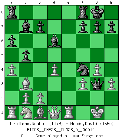Last move : 0-1 2010 February 14 19:22:24 [Event "FICGS__CHESS__CLASS_D__000141"] [Site "FICGS"] [Date "2010.02.02"] [Round "1"] [White "Cridland,Graham"] [Black "Moody,David"] [Result "0-1"] [WhiteElo "1479"] [BlackElo "1560"] 1.e4 e5 2.Nf3 Nc6 3.Bb5 a6 4.Ba4 Nf6 5.O-O Be7 6.Re1 b5 7.Bb3 O-O 8.h3 Bb7 9.a4 d5 10.exd5 Nxd5 11.Nxe5 Nxe5 12.Rxe5 Nf4 13.f3 Bd6 14.Re1 Qg5 15.g4 Qh4 16.d4 Qg3+ 0-1 Ruy Lopez : Closed, 7...O-O Kingside Castling by player White (move 5) Kingside Castling by player Black (move 7) Player Black won this chess game. Follow this game move after move (download)Bobby just drops the pieces and they fall on the right squares. (Miguel Najdorf) Vielleicht wirkt die Aura früherer Spieler glanzvoller als die der heutigen Spieler, aber das liegt daran, dass man kein Programm wie Fritz hatte, das einem all die Löcher in ihren Partien zeigt. (Vladimir Kramnik) Puntos débiles o agujeros en la posición de tu oponente deben de ser ocupados por piezas, no Peones. (Siegbert Tarrasch) Les erreurs sont comme les malheurs, elles n'arrivent jamais seules. (Siegbert Tarrasch) Without deviation from the norm, progress is not possible. (Frank Zappa)
