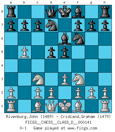 Last move : 0-1 2010 March 17 9:16:45 [Event "FICGS__CHESS__CLASS_D__000141"] [Site "FICGS"] [Date "2010.02.02"] [Round "1"] [White "Rivenburg,John"] [Black "Cridland,Graham"] [Result "0-1"] [WhiteElo "1489"] [BlackElo "1479"] 1.b4 e5 2.b5 d5 3.e3 Be6 4.Nf3 Nd7 5.Nc3 Ngf6 0-1 This chess game has been lost on time (started : 2010.02.02 14:33:38) Polish (Sokolsky) opening Player Black won this chess game. Follow this game move after move (download)Chess is the art of analysis. (Mikhail Botvinnik) Ein Buch ist ein Spiegel; wenn ein Affe hineinsieht, so kann kein Apostel heraus gucken. (Georg Christoph Lichtenberg) Cada Peón es una Reina en potencia. (James Mason) Toutes les manuvres exécutées sur une colonne ouverte ont pour but ultime l'intrusion définitive sur la septième ou la huitième rangée, en plein cur de la position ennemie. (Aaron Nimzovitch) It is the aim of the modern school, not to treat every position according to one general law, but according to the principle inherent in the position. (Richard Reti)